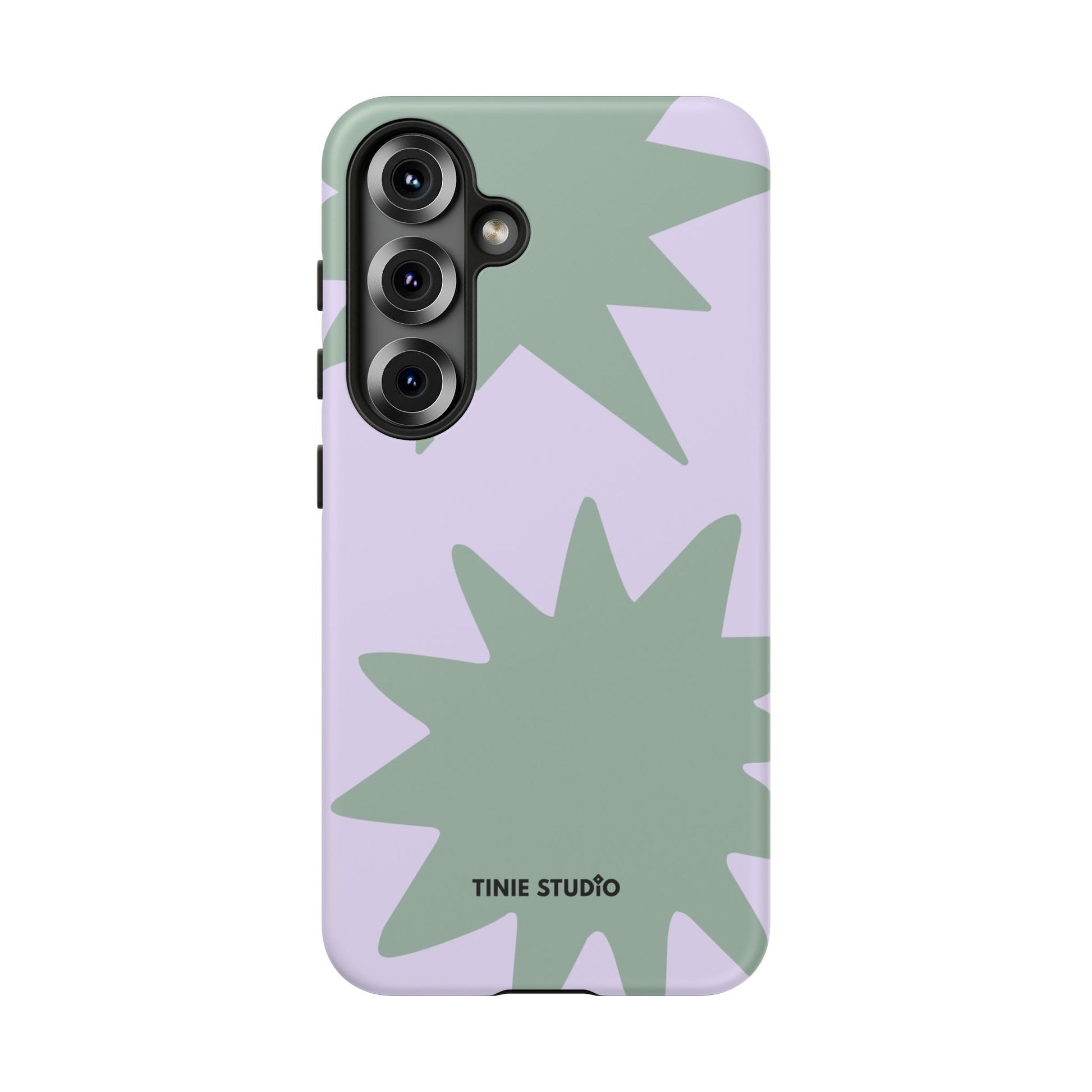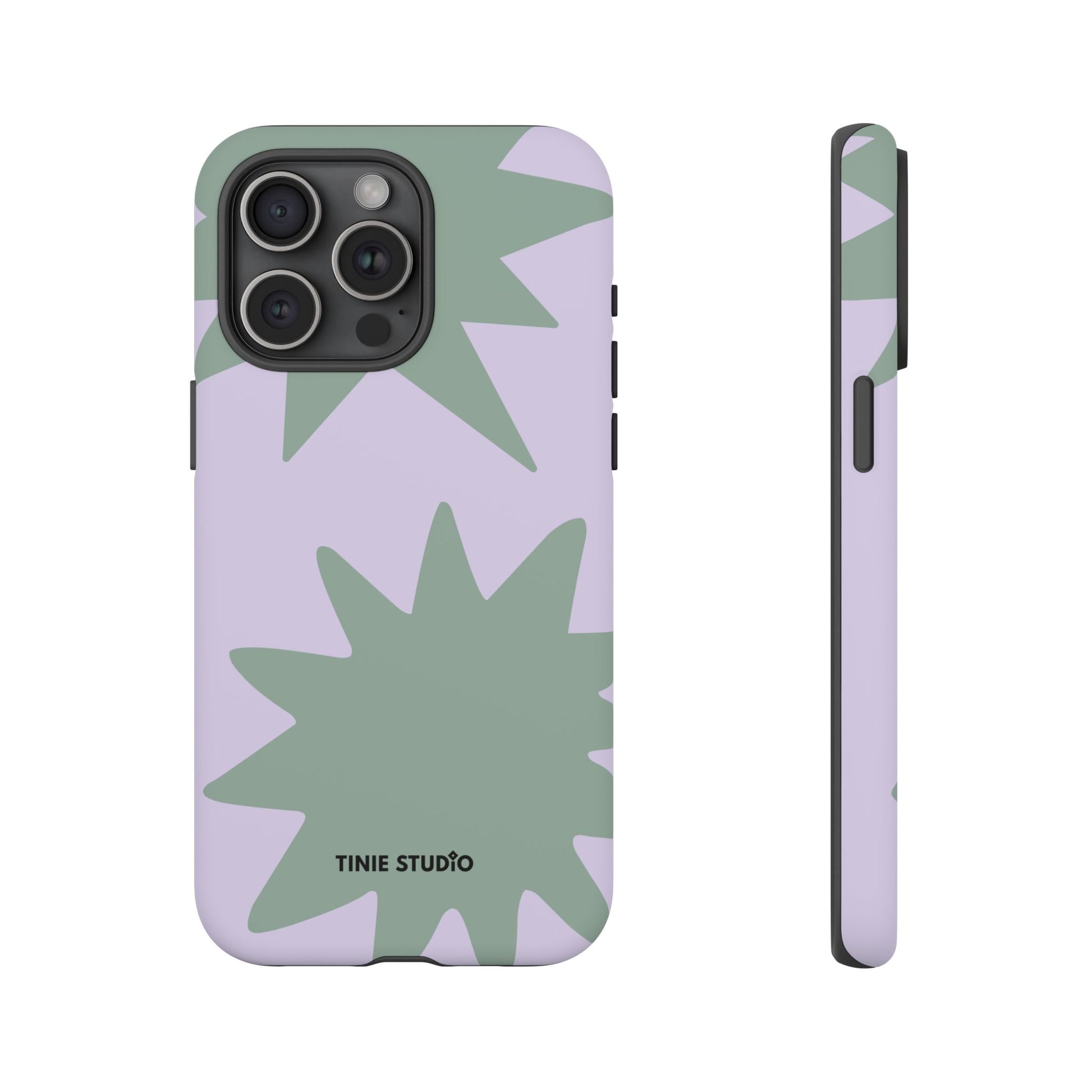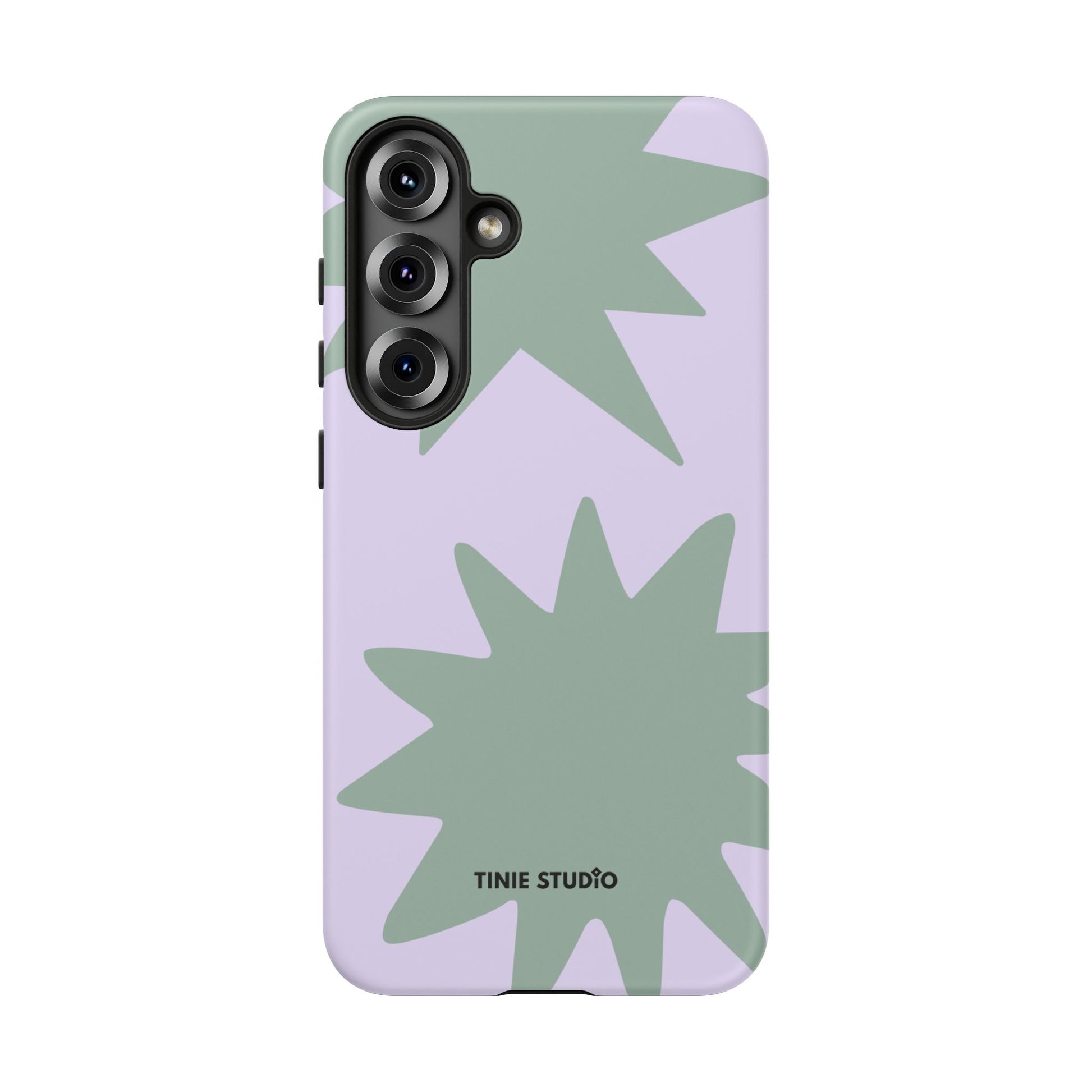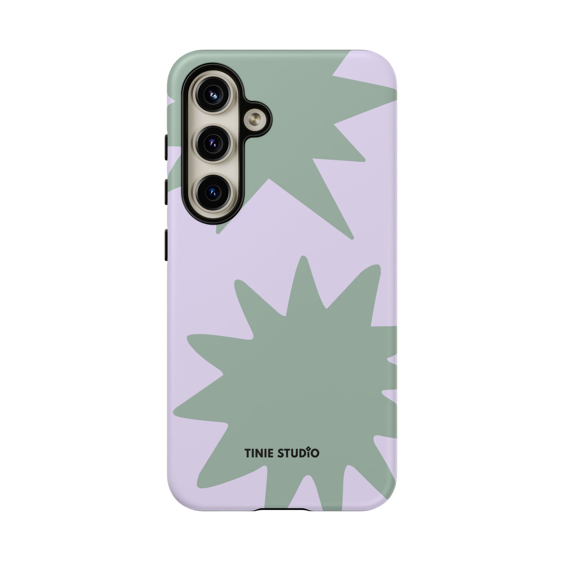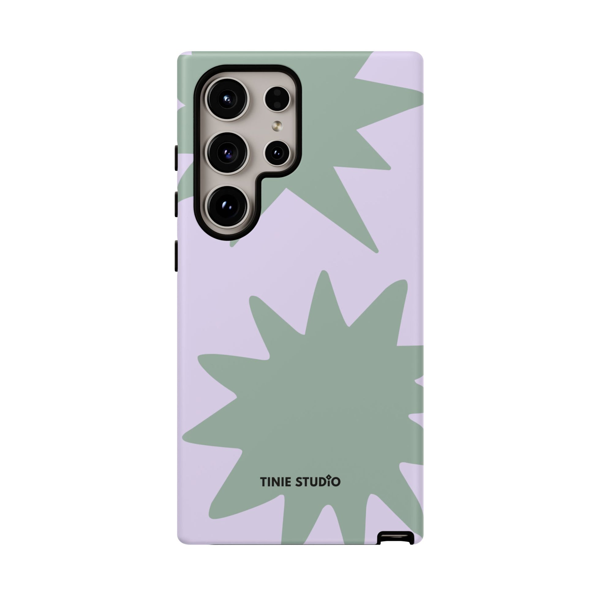 Dieses Design verteilt übergroße sternförmige Motive in Salbeigrün auf einem zarten Lavendelhintergrund – ein spannender Mix aus ruhigen Farben und kräftigen Formen. Grafisch und trotzdem luftig – perfekt, um deinem Outfit ein bisschen funkelnden Spaß zu geben, ohne den minimalistischen Style zu verlieren.