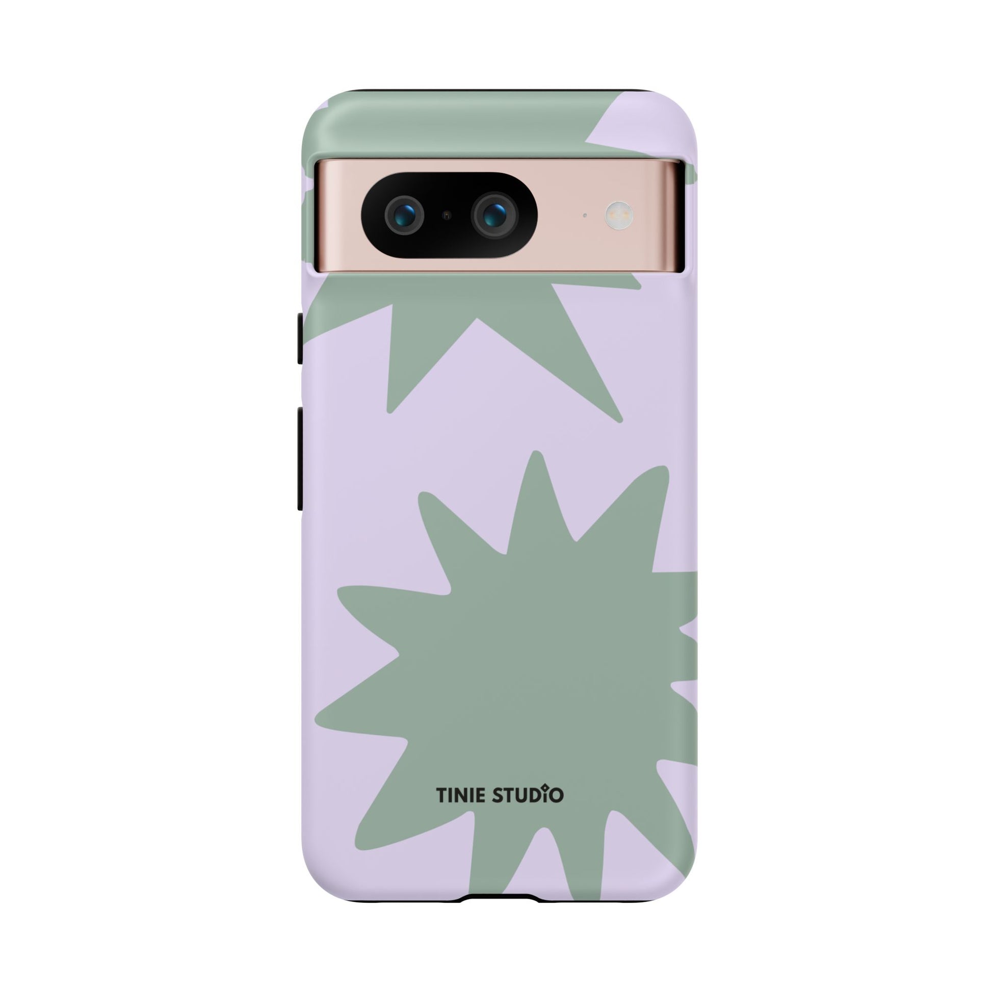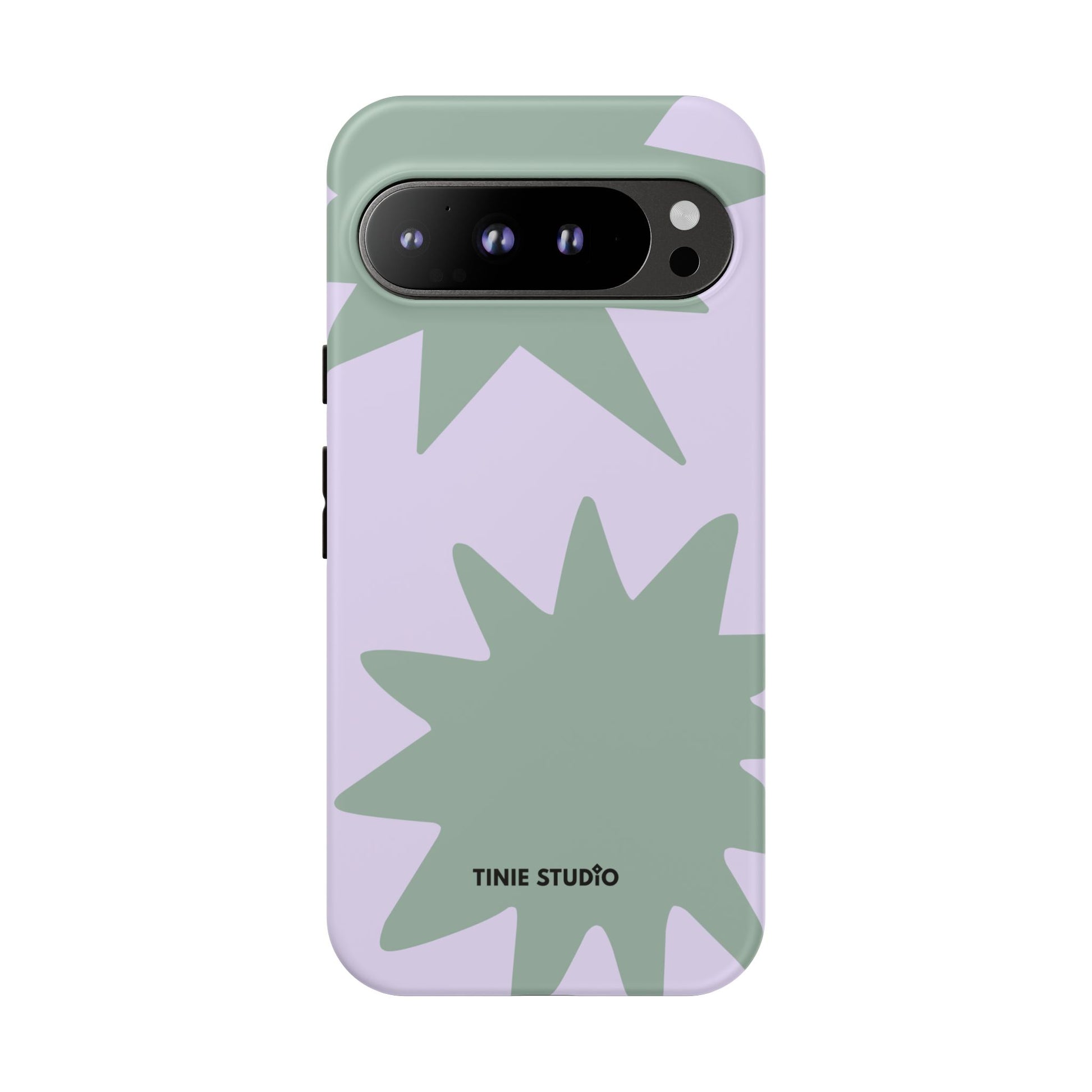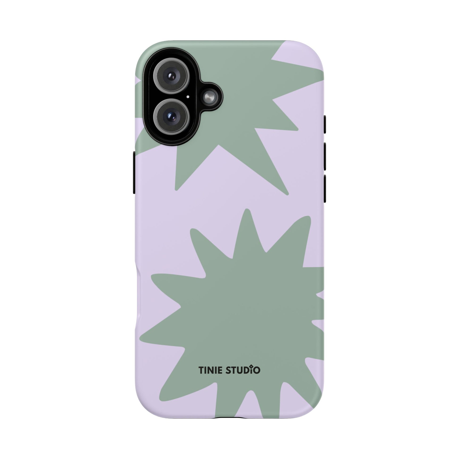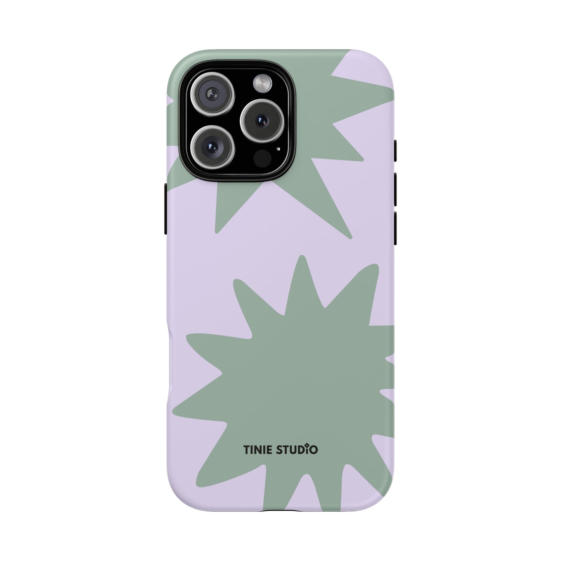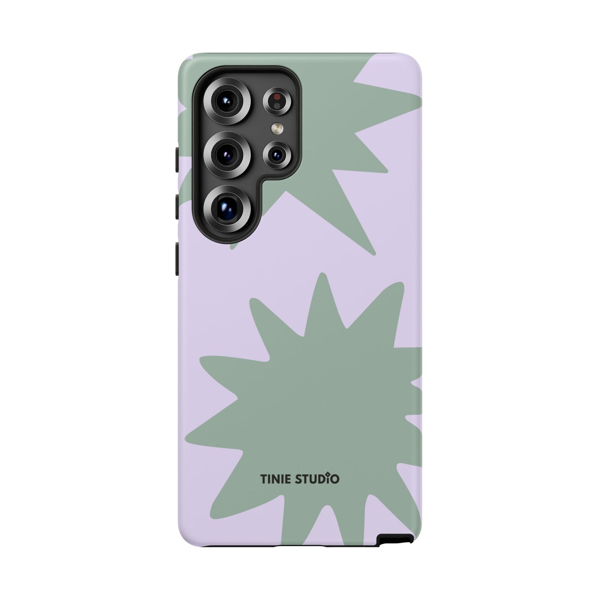 Dieses Design verteilt übergroße sternförmige Motive in Salbeigrün auf einem zarten Lavendelhintergrund – ein spannender Mix aus ruhigen Farben und kräftigen Formen. Grafisch und trotzdem luftig – perfekt, um deinem Outfit ein bisschen funkelnden Spaß zu geben, ohne den minimalistischen Style zu verlieren.