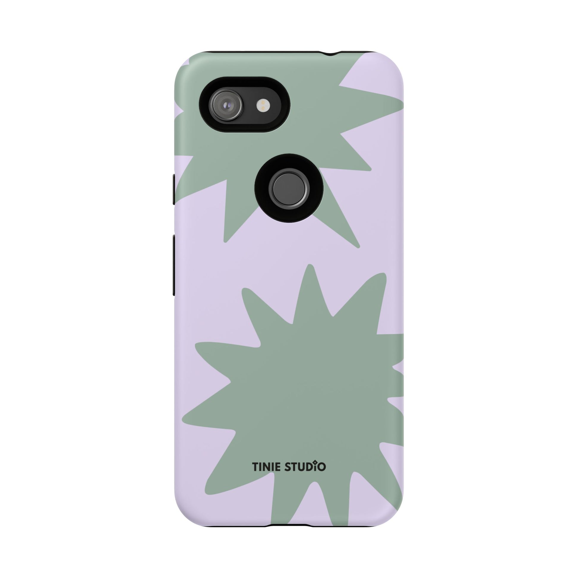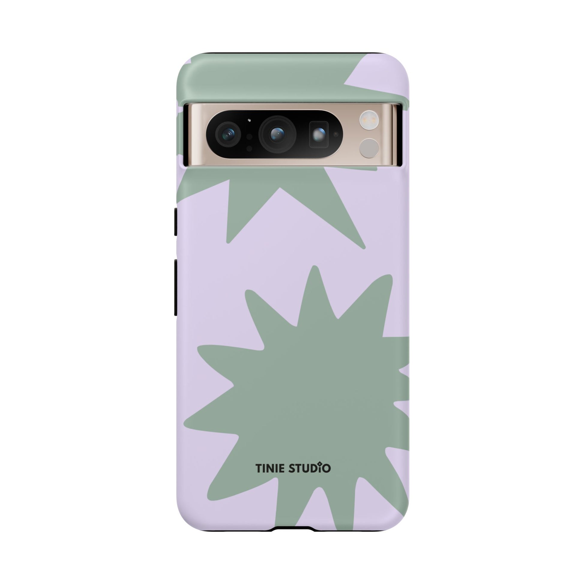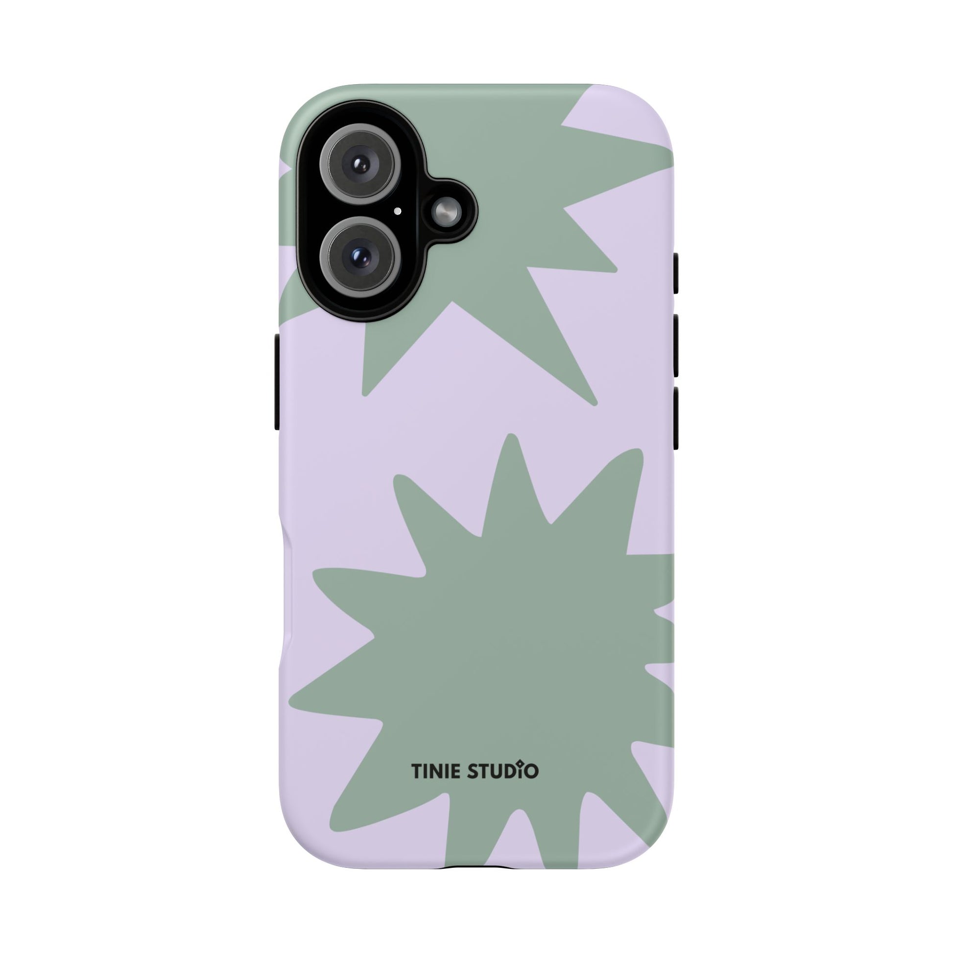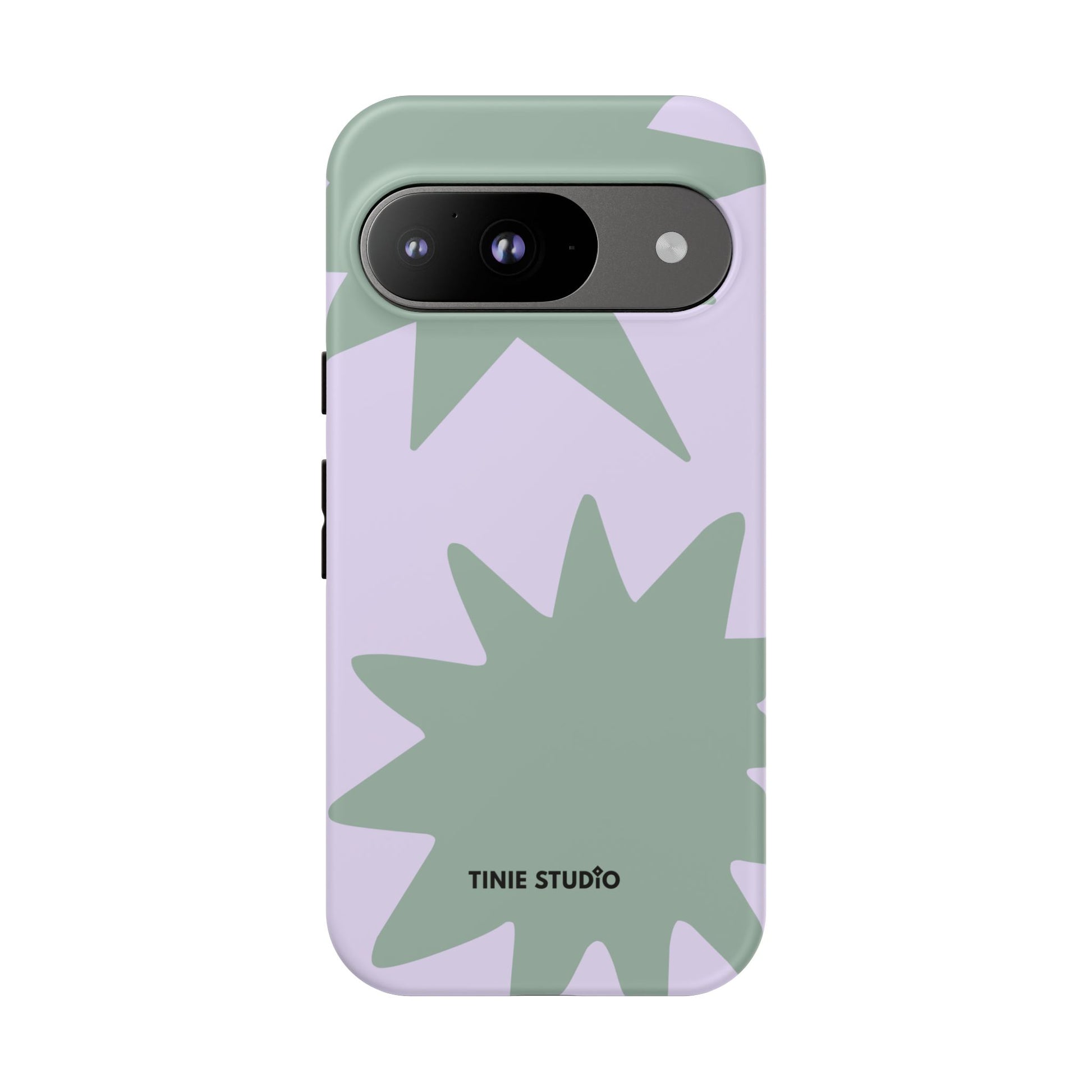 Dieses Design verteilt übergroße sternförmige Motive in Salbeigrün auf einem zarten Lavendelhintergrund – ein spannender Mix aus ruhigen Farben und kräftigen Formen. Grafisch und trotzdem luftig – perfekt, um deinem Outfit ein bisschen funkelnden Spaß zu geben, ohne den minimalistischen Style zu verlieren.