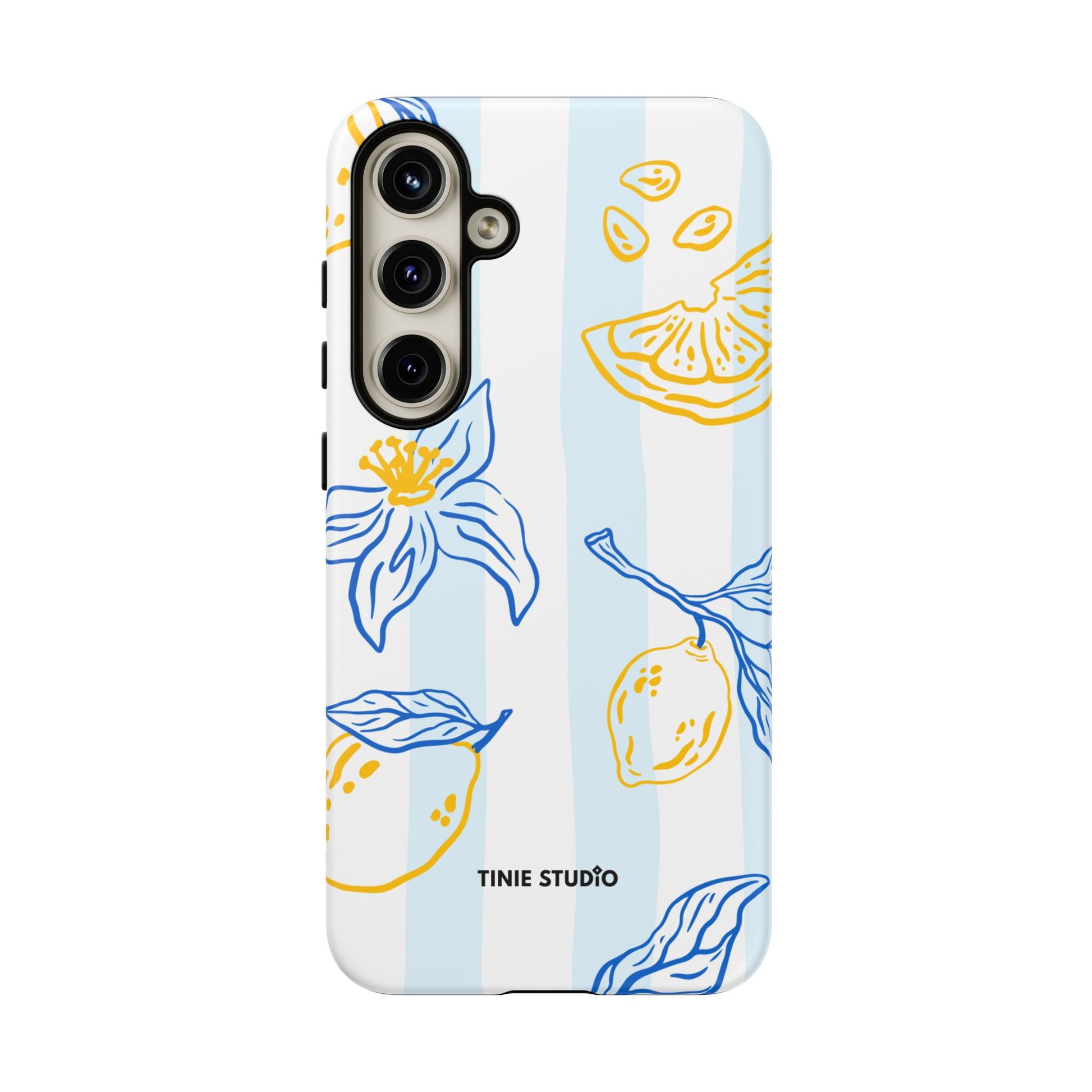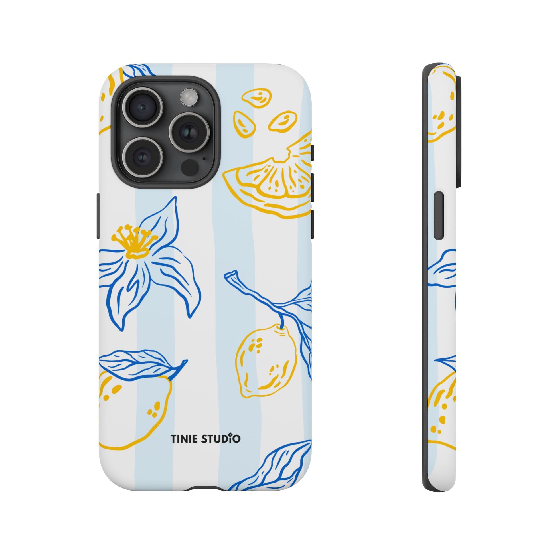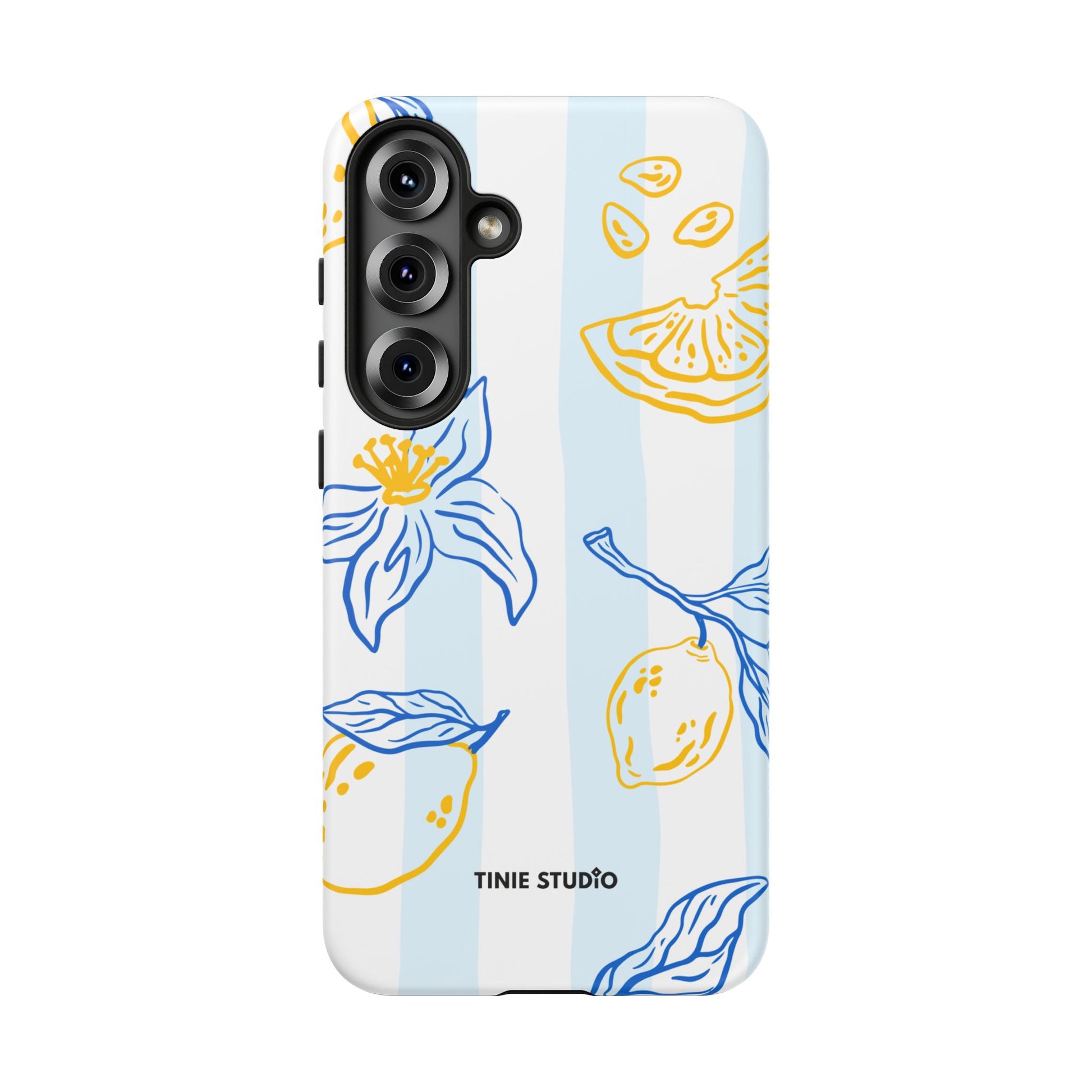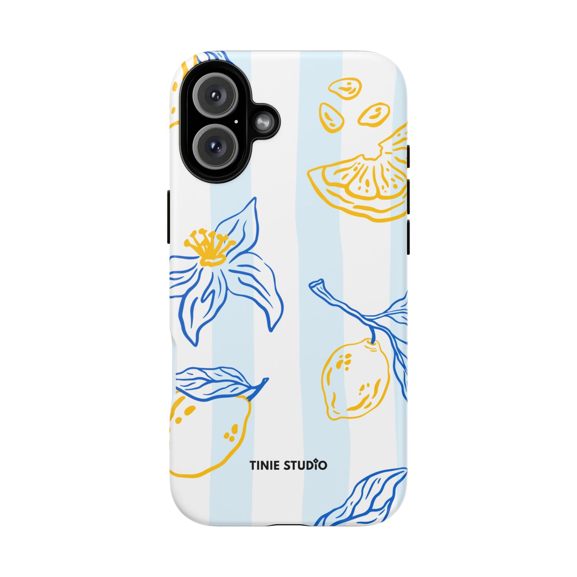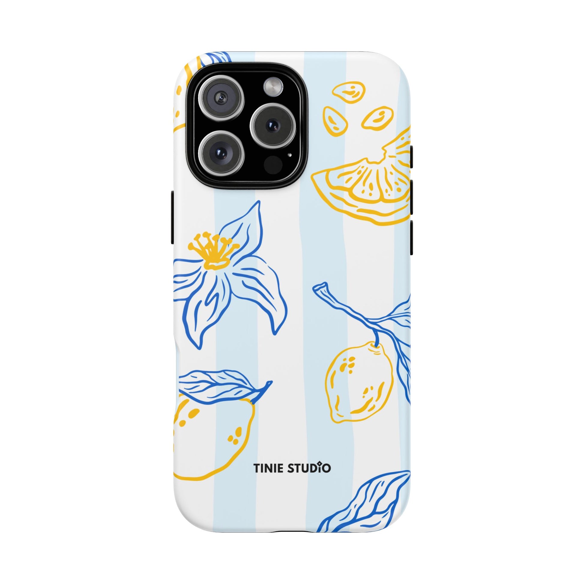 This design blends soft blue stripes with hand-drawn lemons, blossoms, and seeds in golden yellow and cobalt. It’s light, zesty, and breezy - like carrying a slice of summer with you wherever you go.