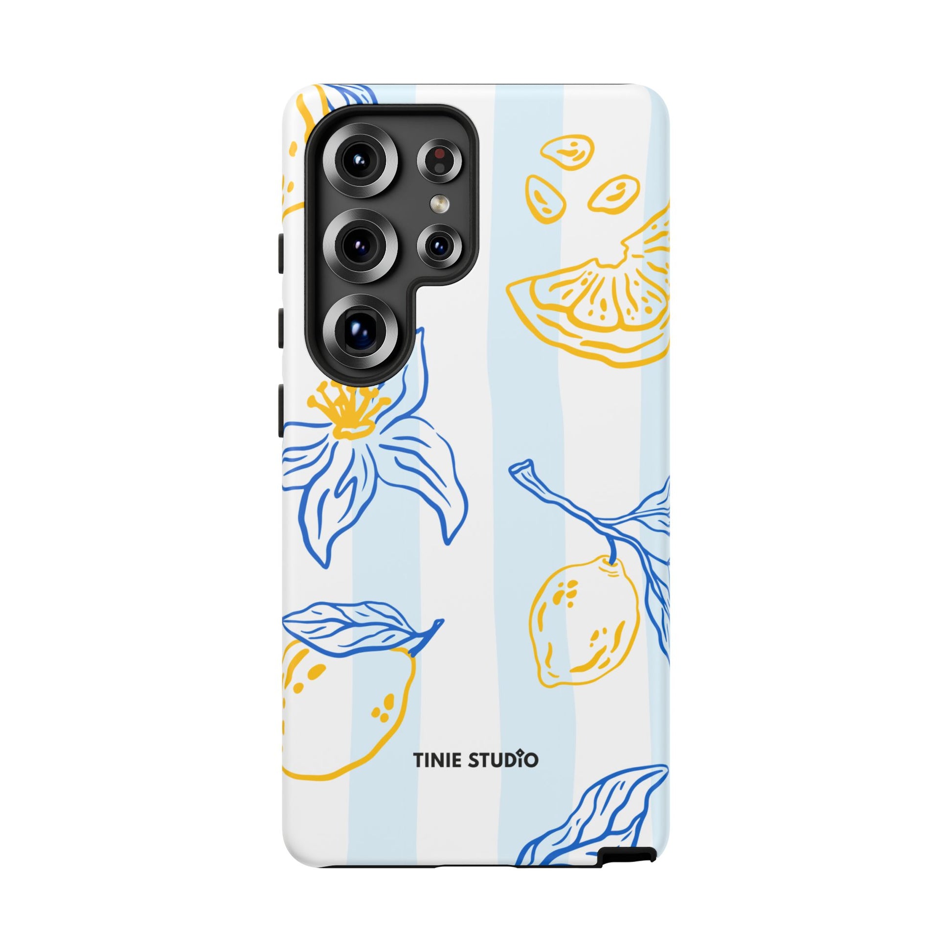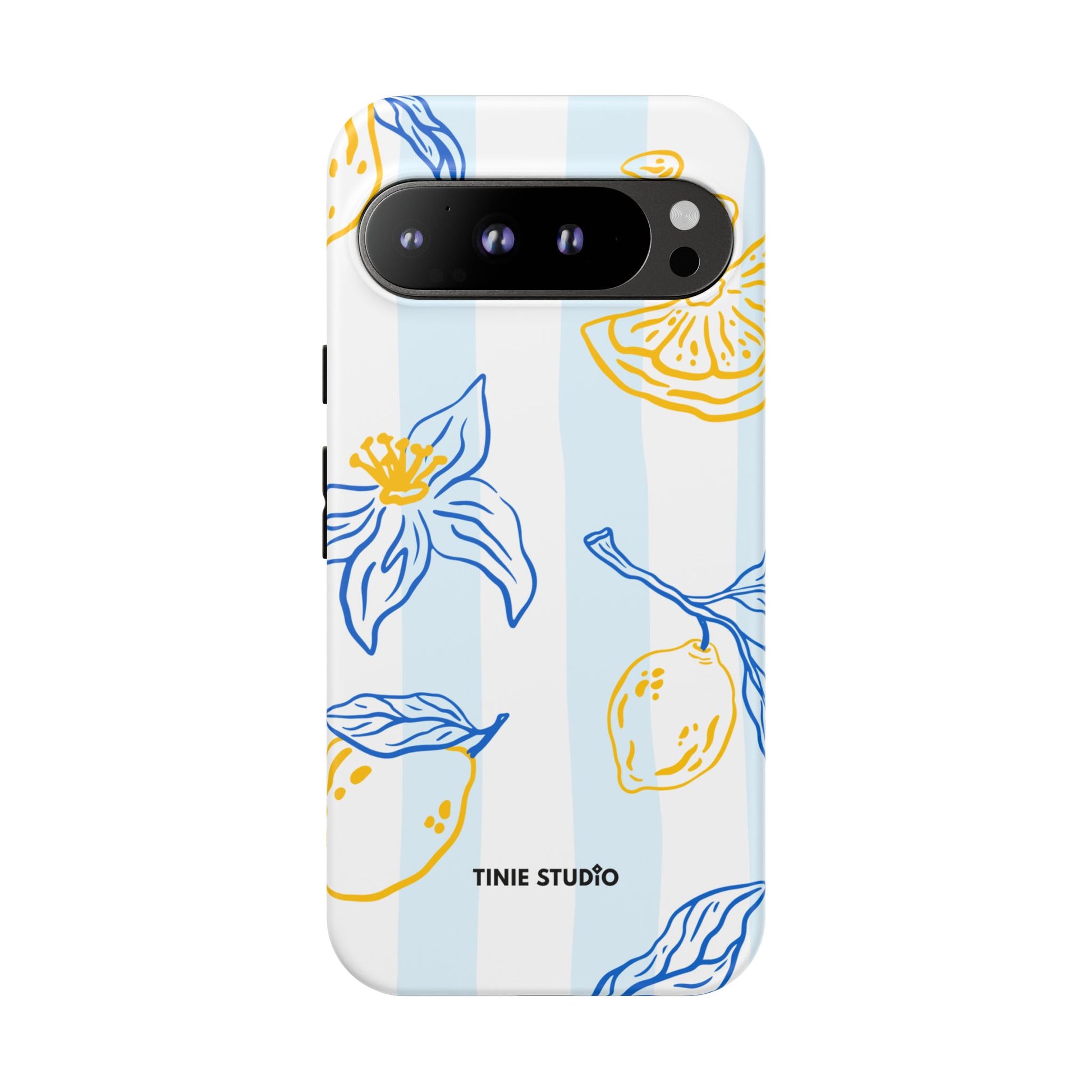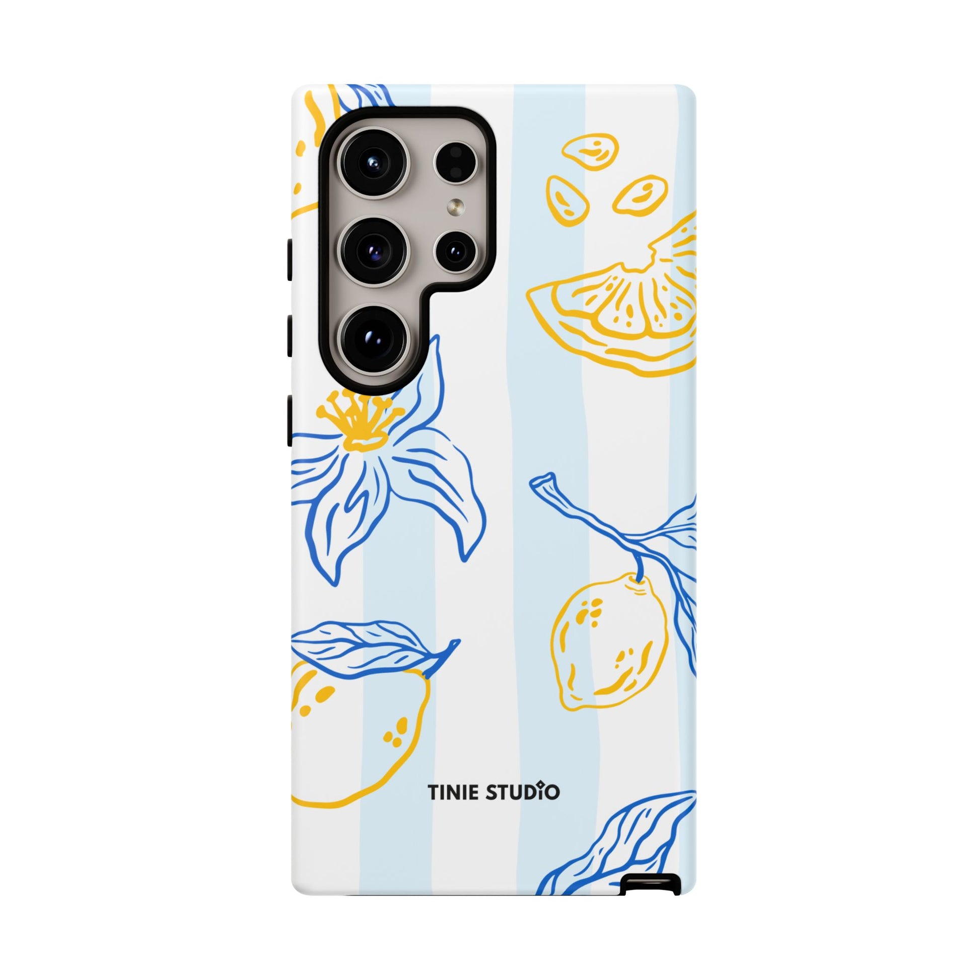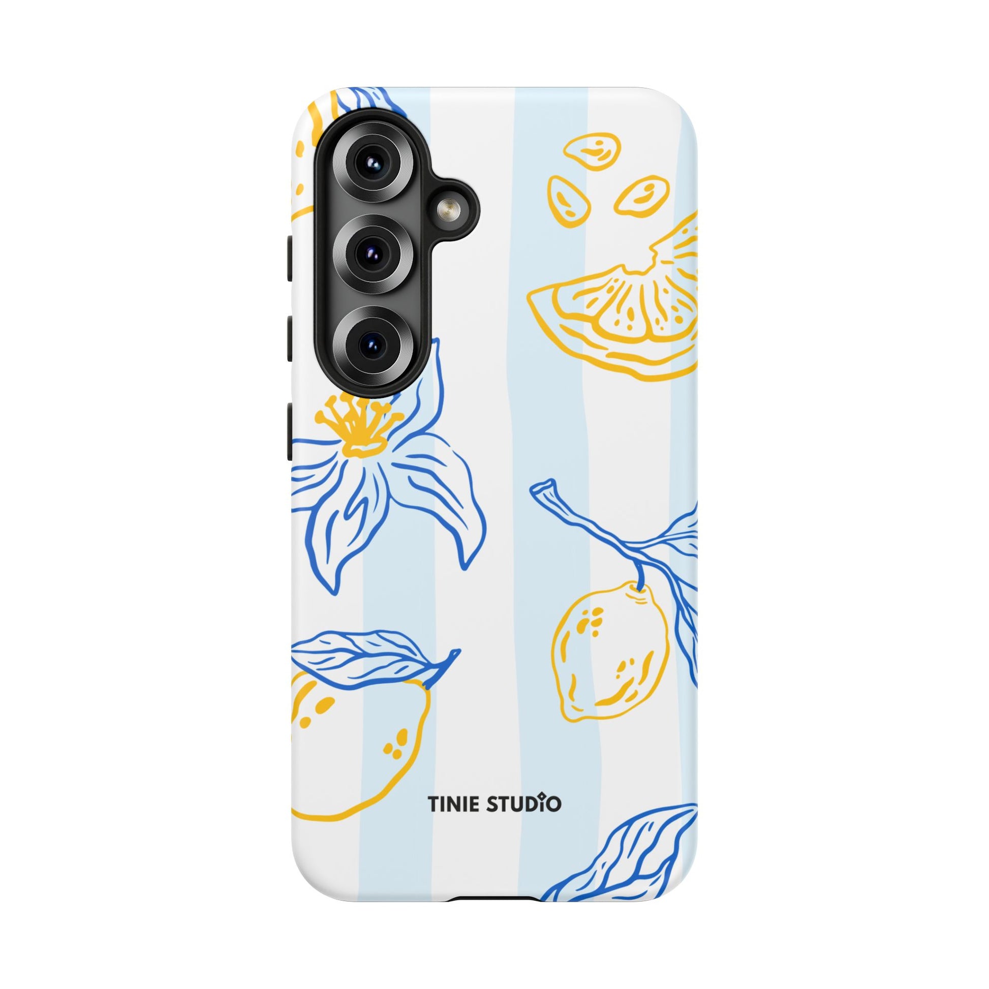 This design blends soft blue stripes with hand-drawn lemons, blossoms, and seeds in golden yellow and cobalt. It’s light, zesty, and breezy - like carrying a slice of summer with you wherever you go.
