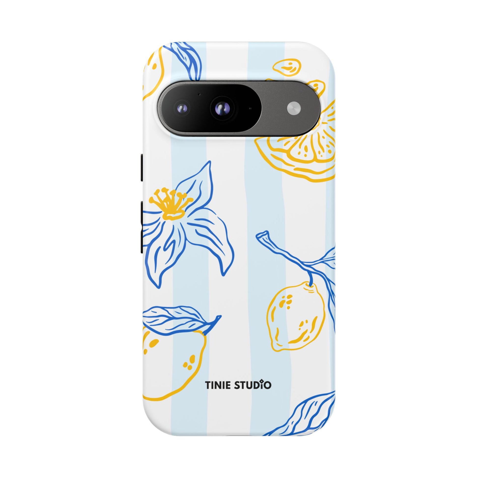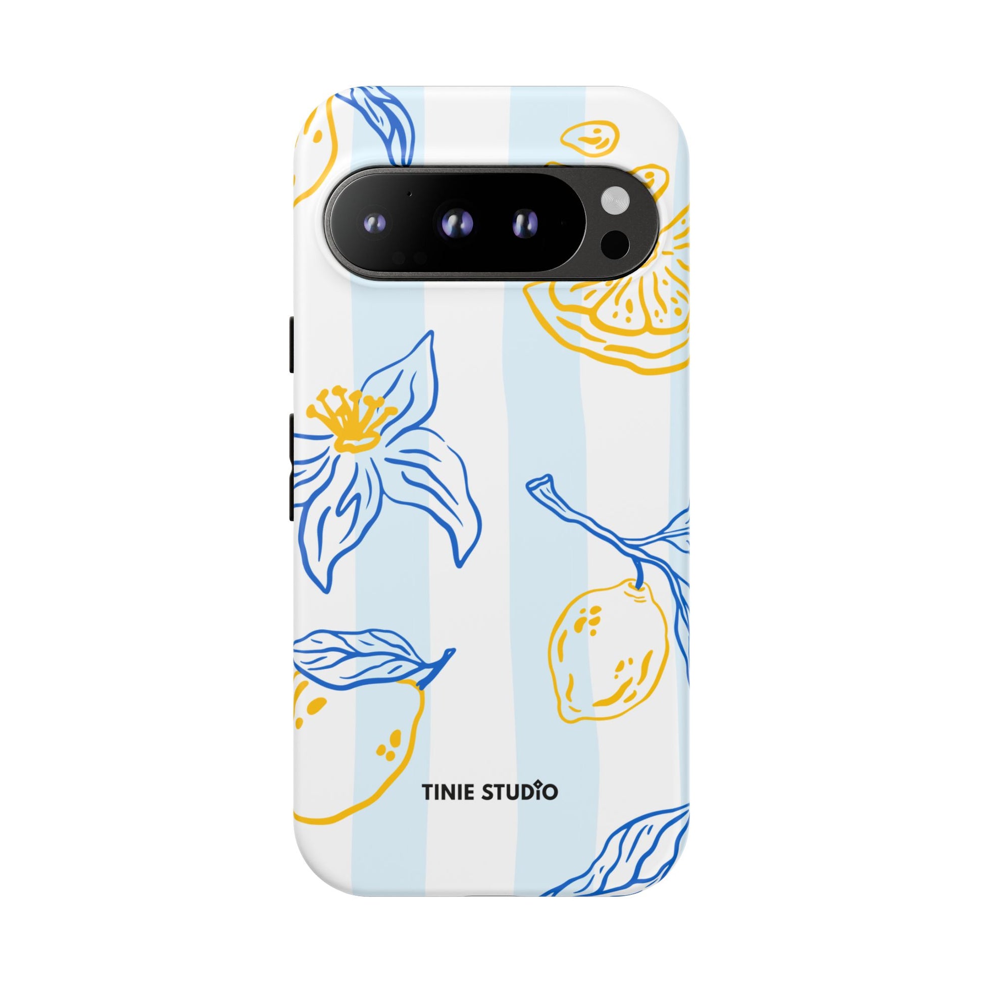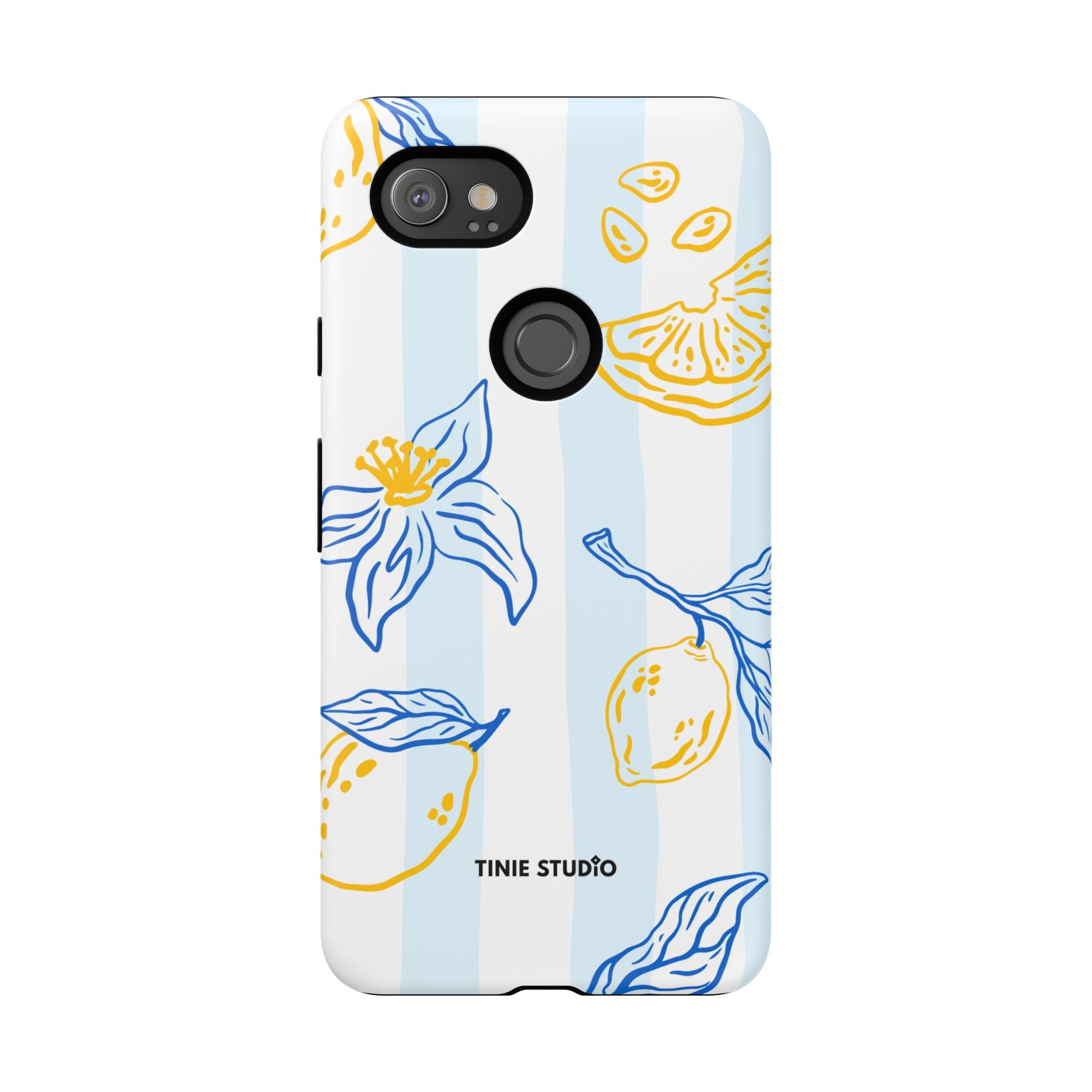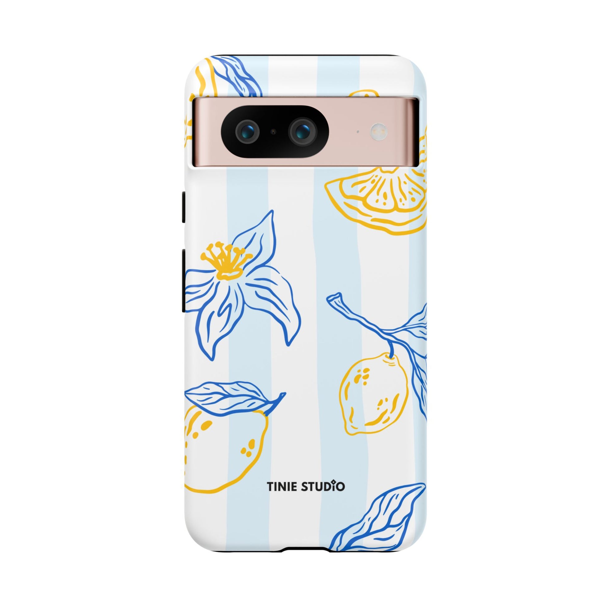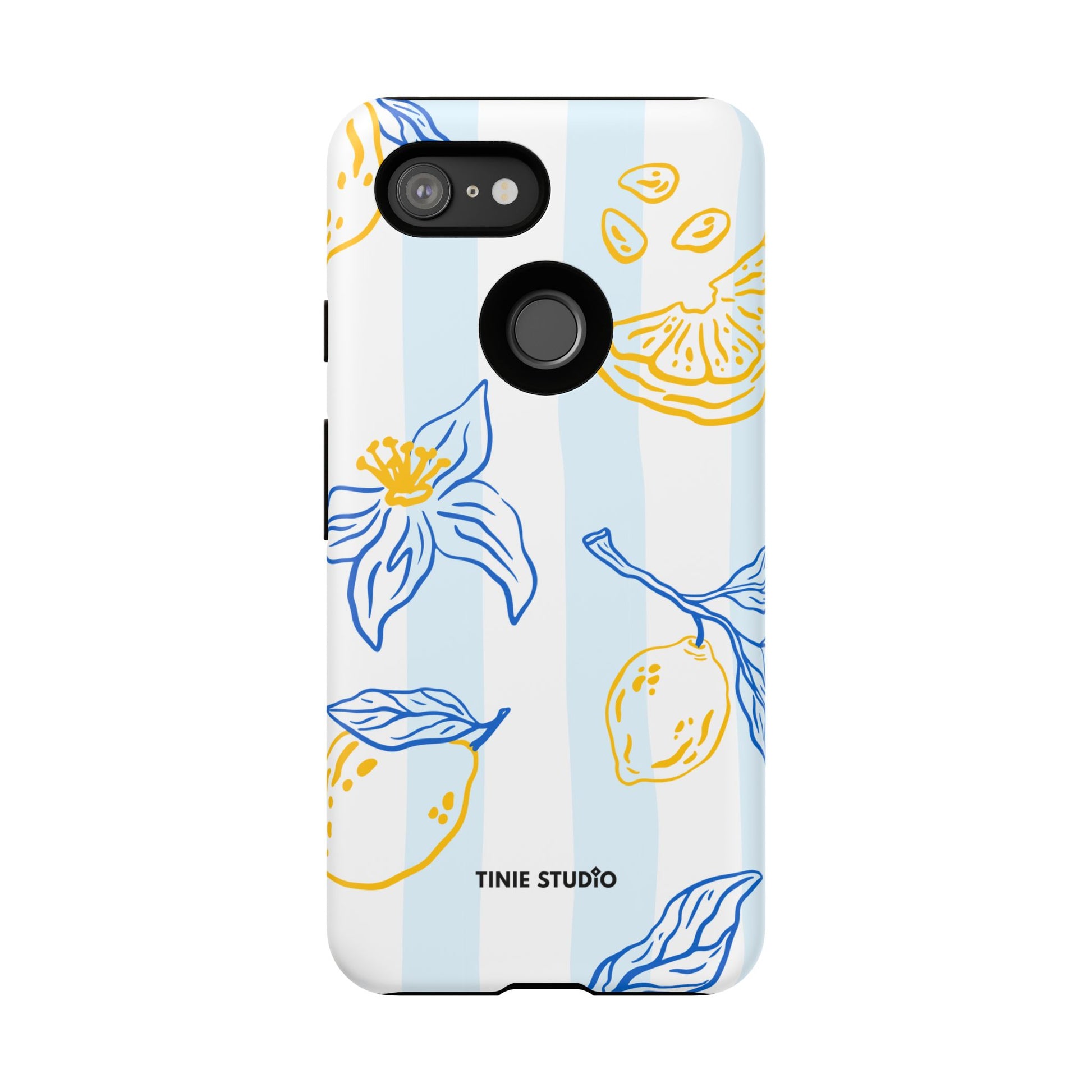 This design blends soft blue stripes with hand-drawn lemons, blossoms, and seeds in golden yellow and cobalt. It’s light, zesty, and breezy - like carrying a slice of summer with you wherever you go.