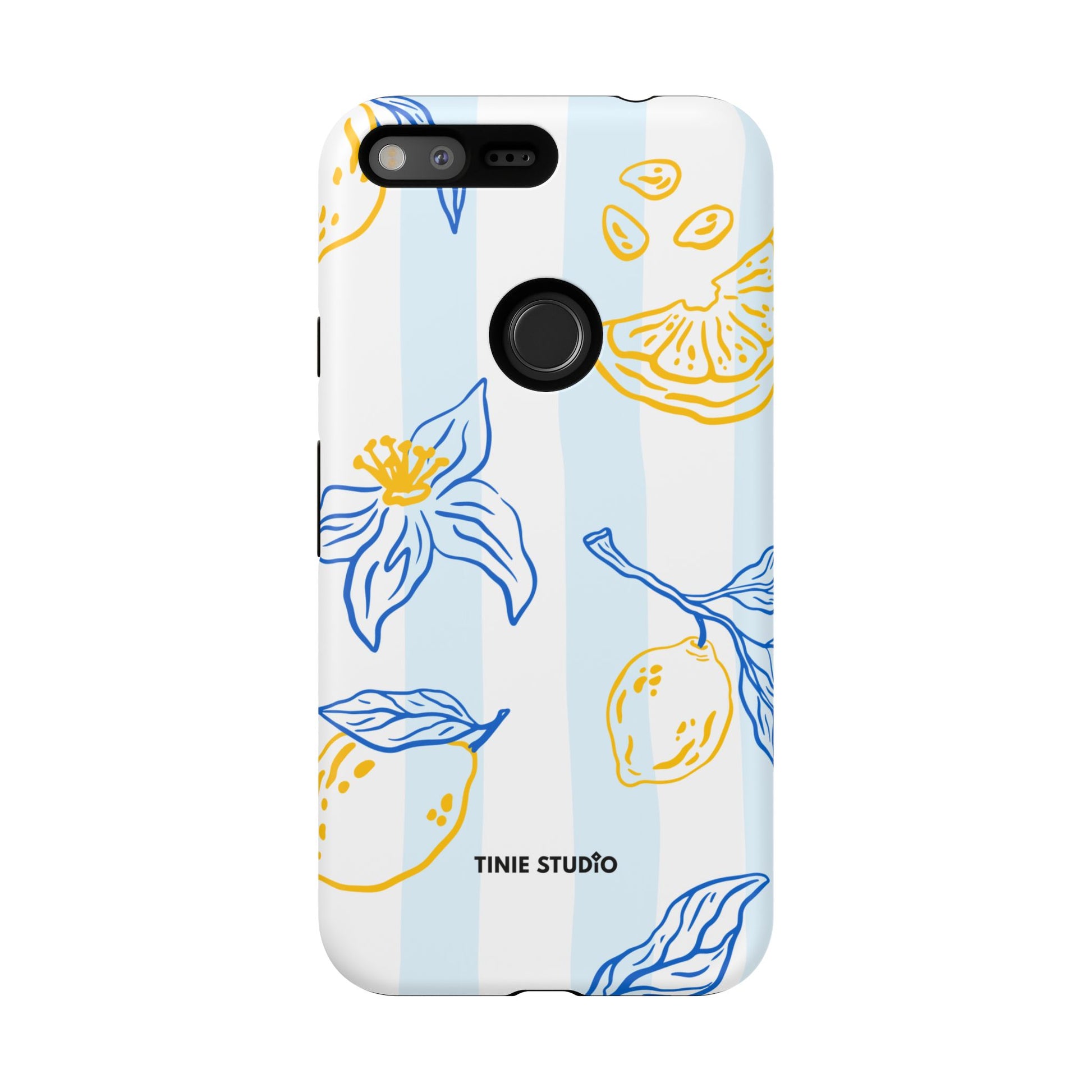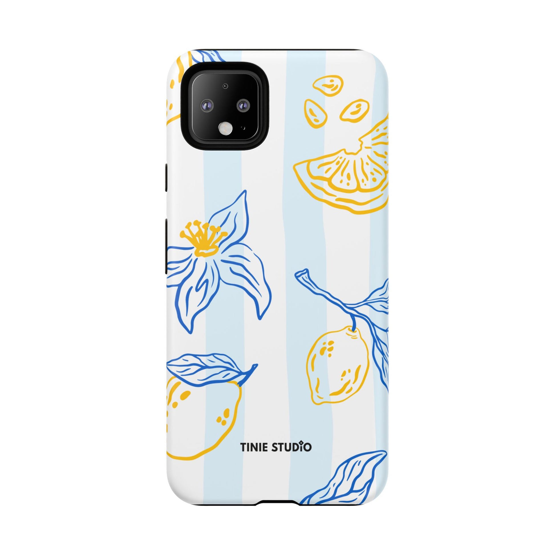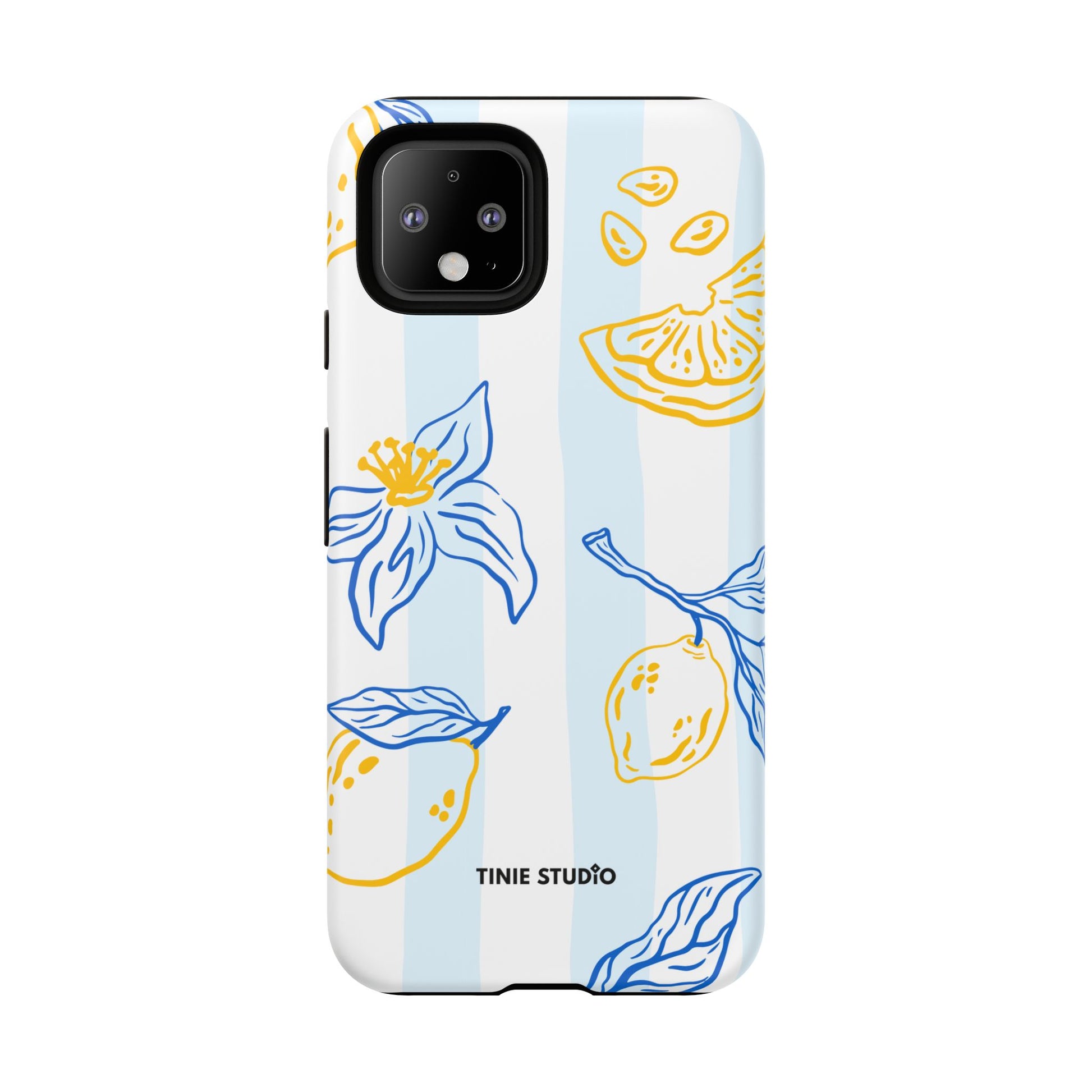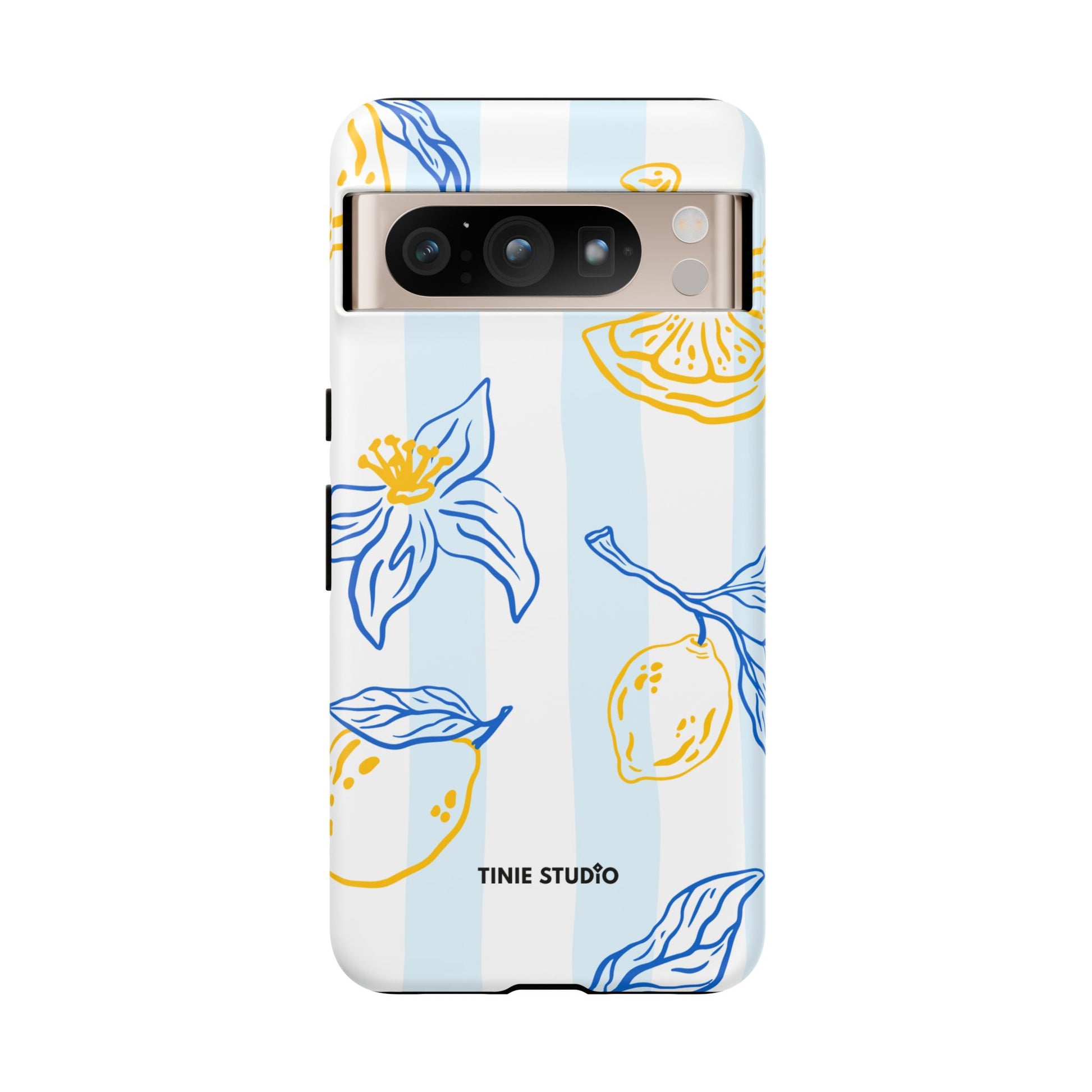 This design blends soft blue stripes with hand-drawn lemons, blossoms, and seeds in golden yellow and cobalt. It’s light, zesty, and breezy - like carrying a slice of summer with you wherever you go.