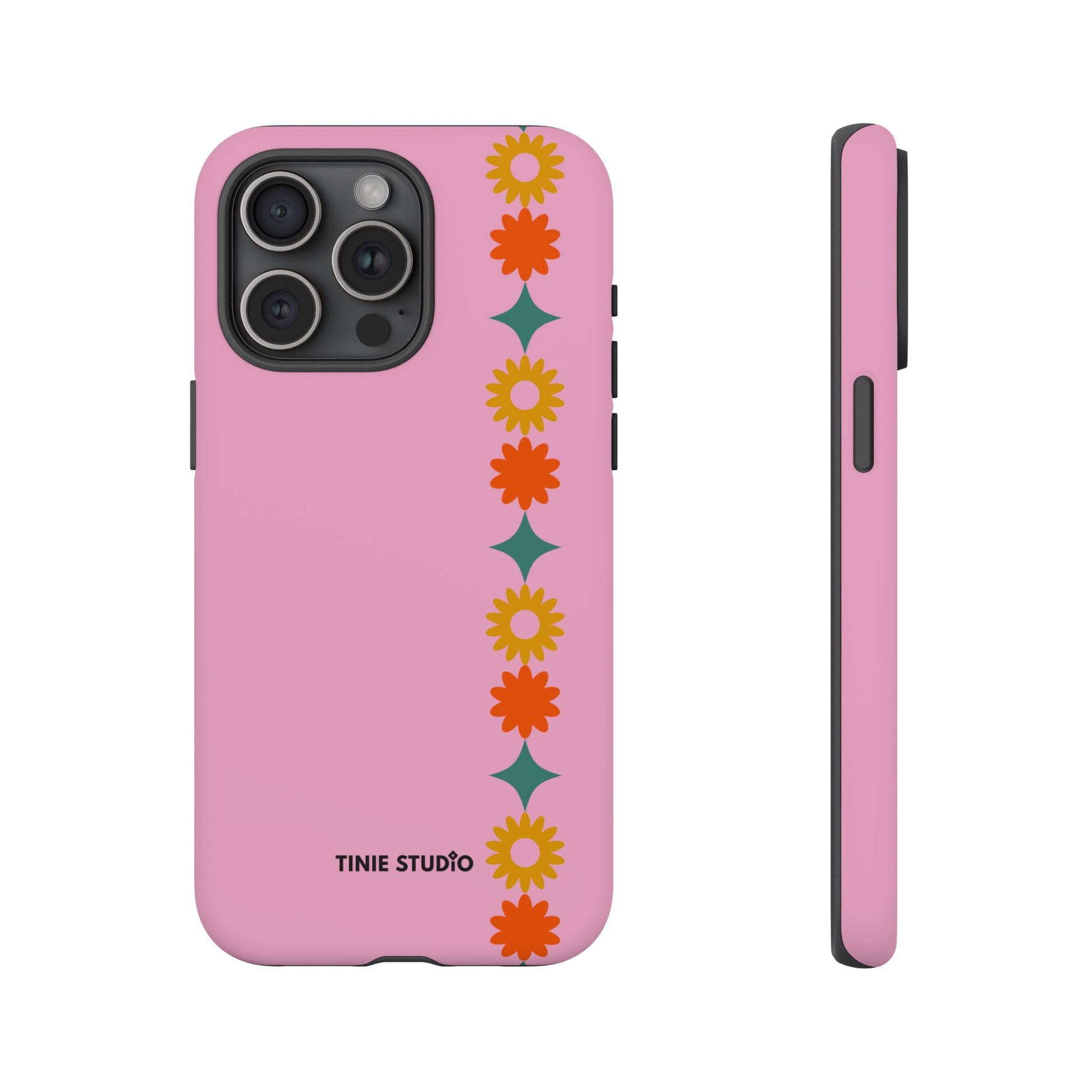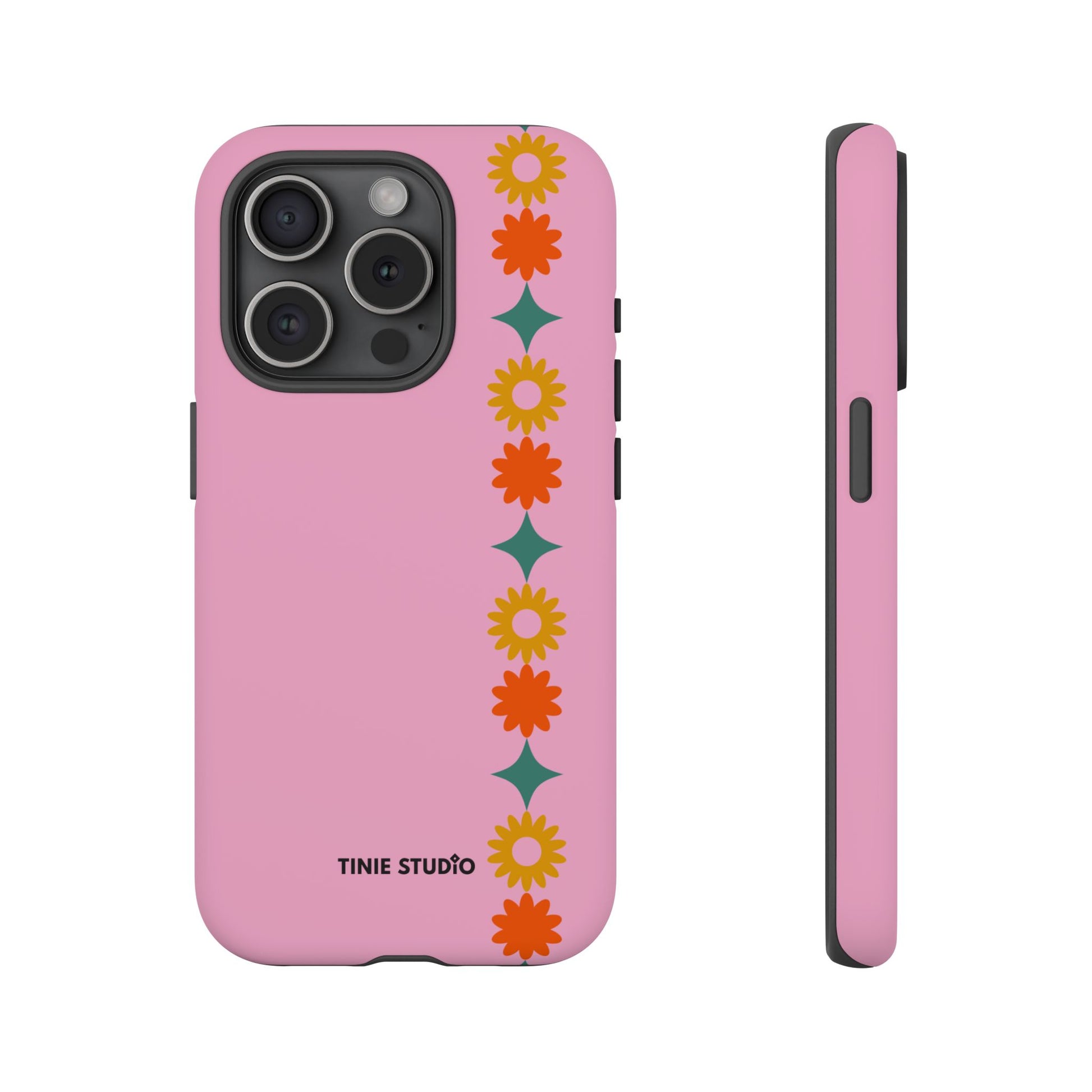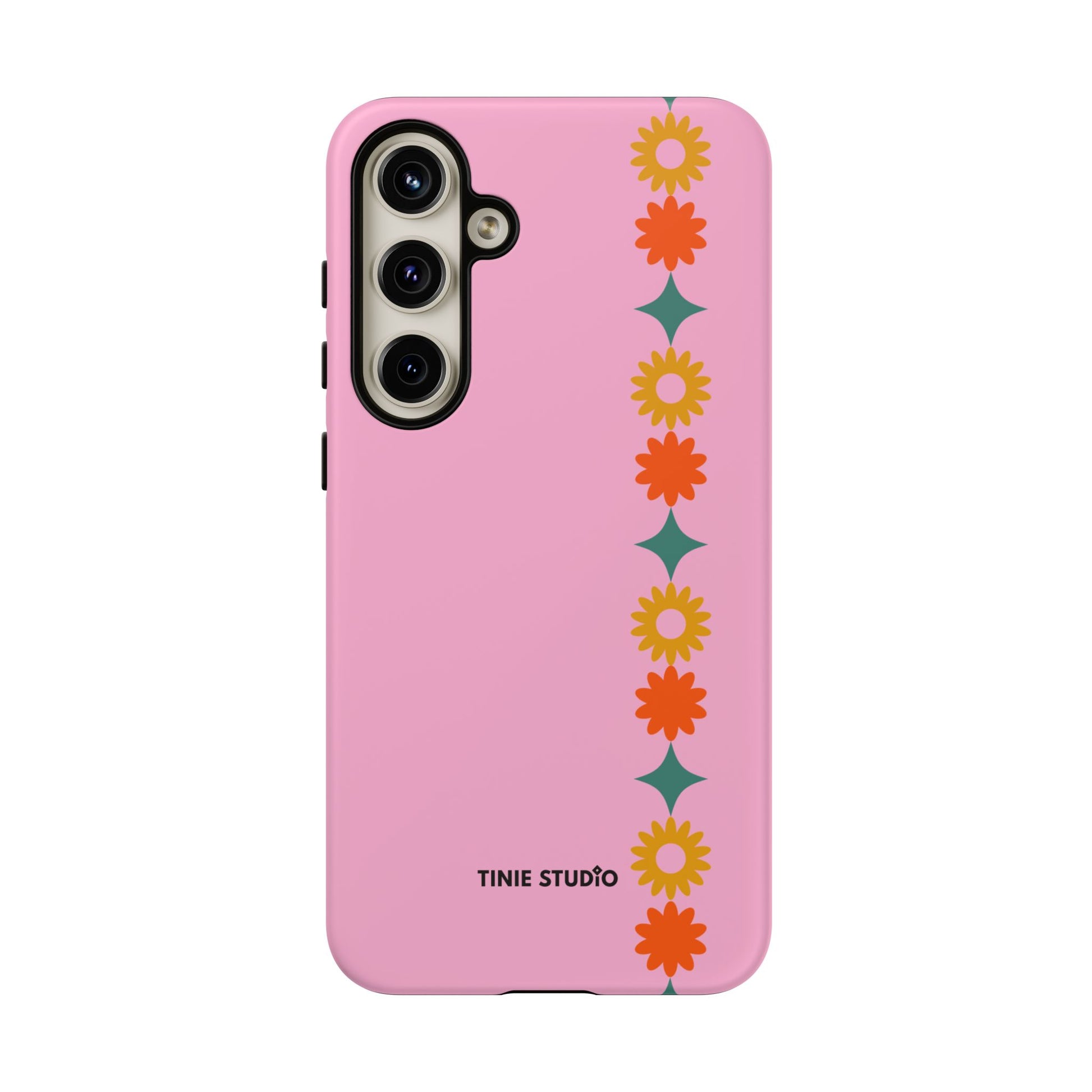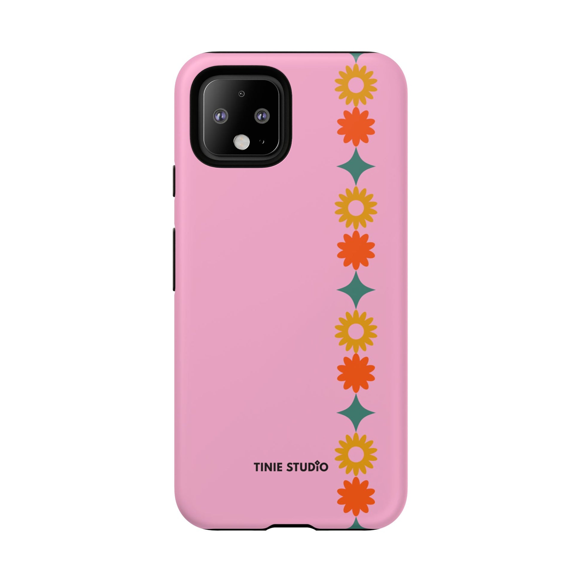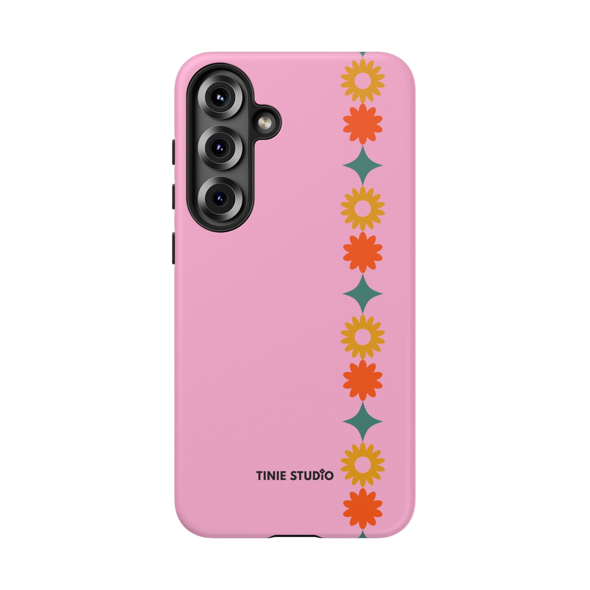 This design runs a cheerful column of graphic blooms in sunny yellow and fiery orange down a soft bubblegum pink backdrop. It’s playful, bright, and designed to make you smile every time you pick up your phone.