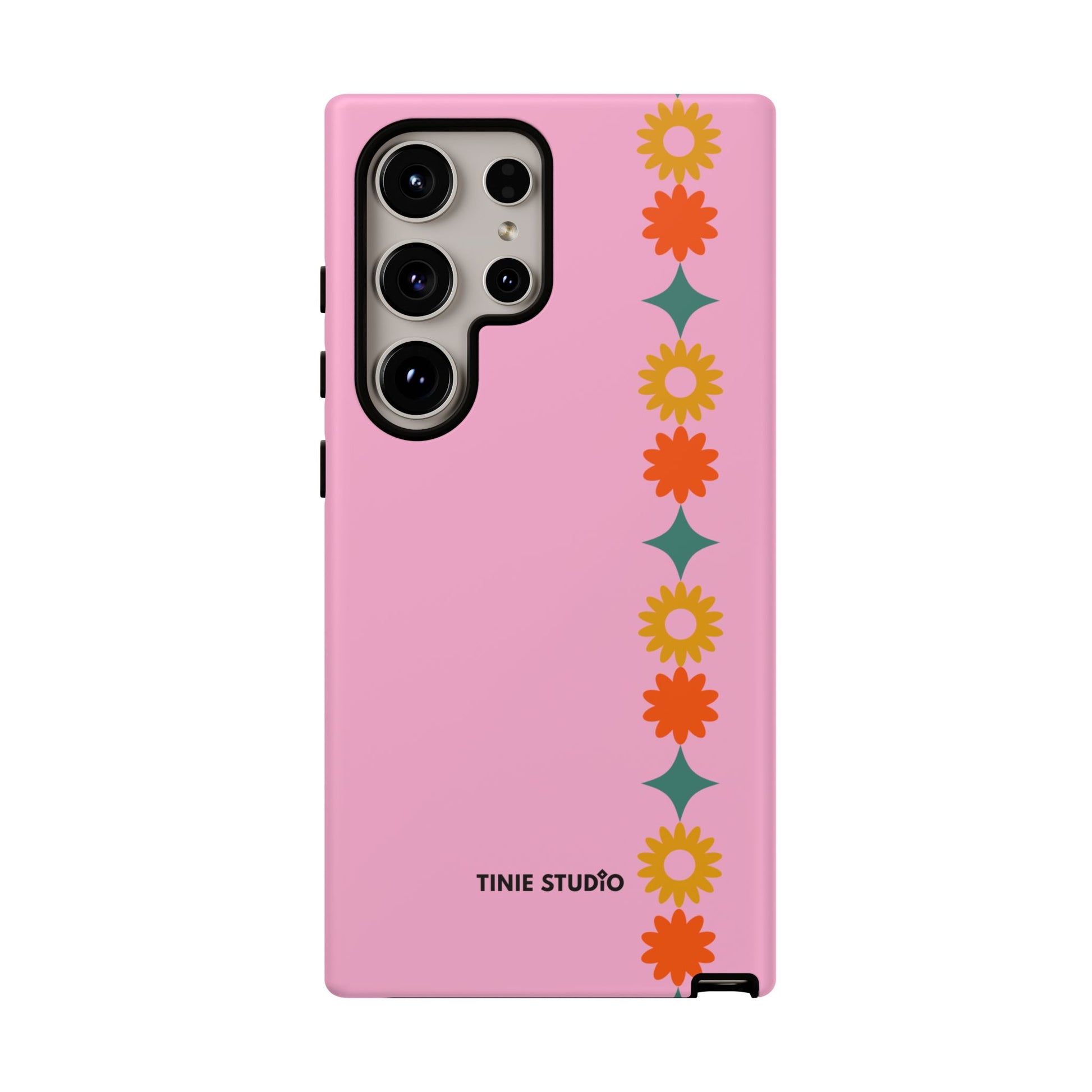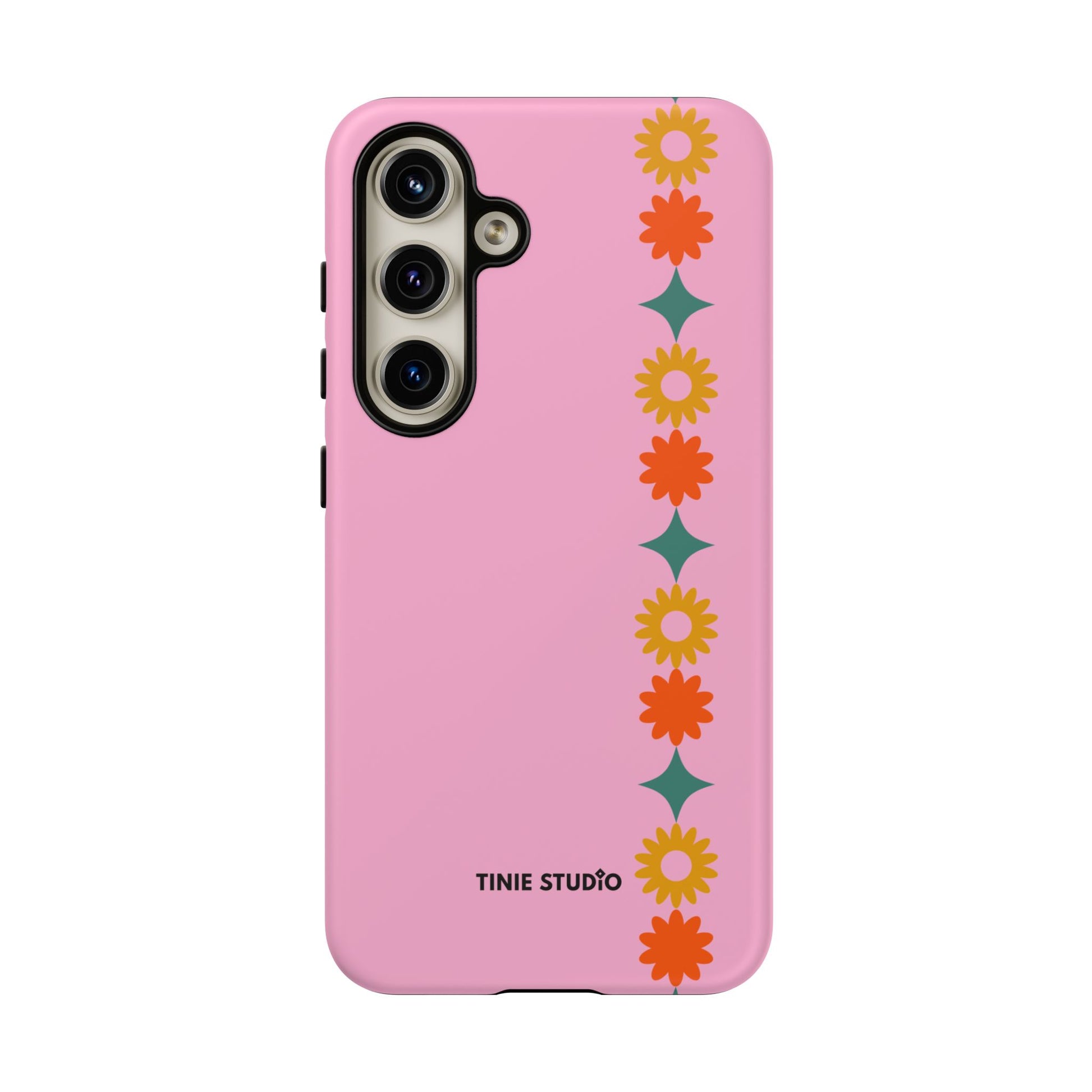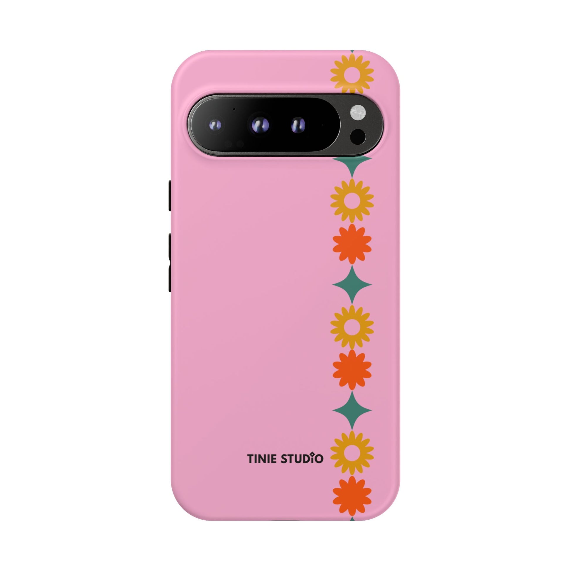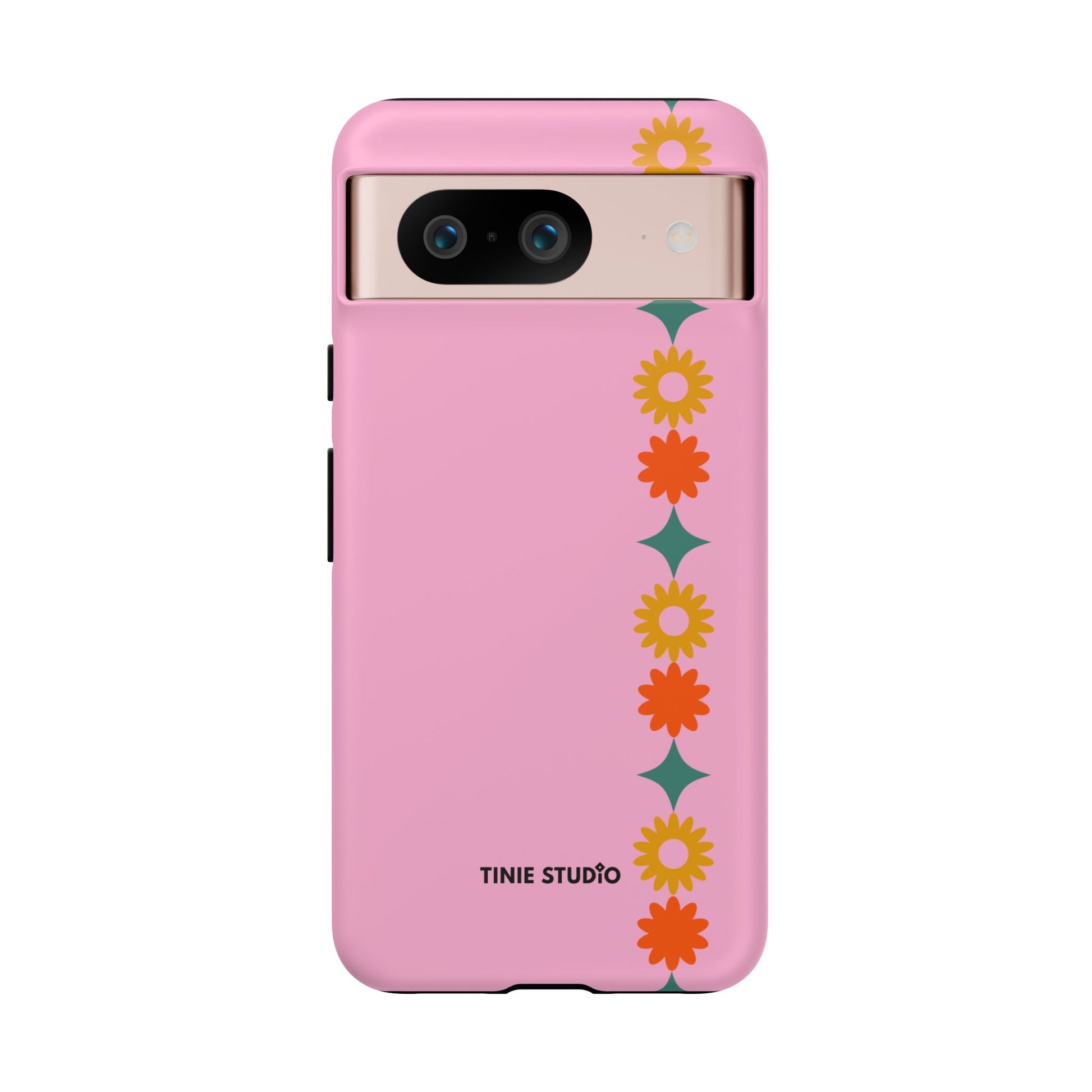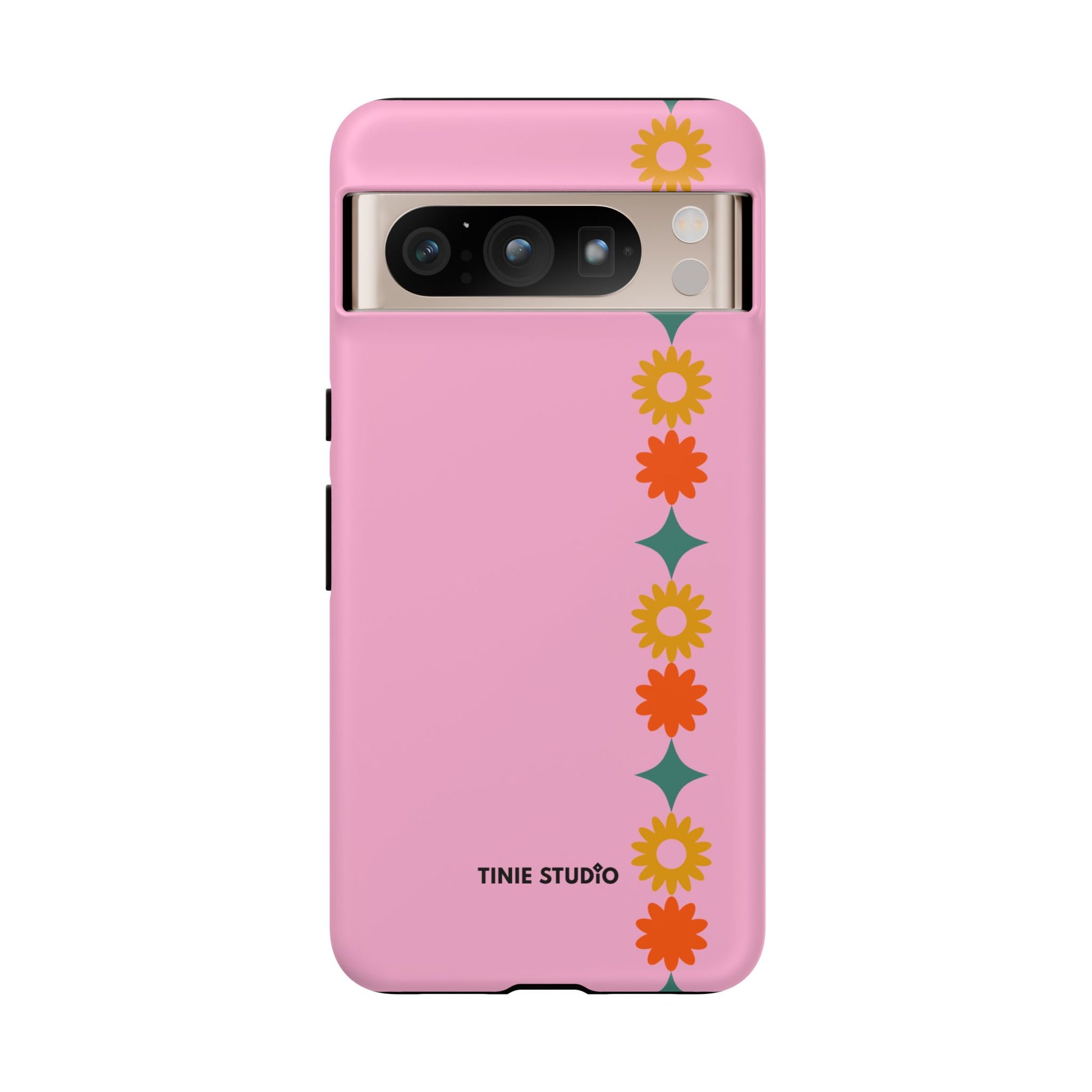 This design runs a cheerful column of graphic blooms in sunny yellow and fiery orange down a soft bubblegum pink backdrop. It’s playful, bright, and designed to make you smile every time you pick up your phone.