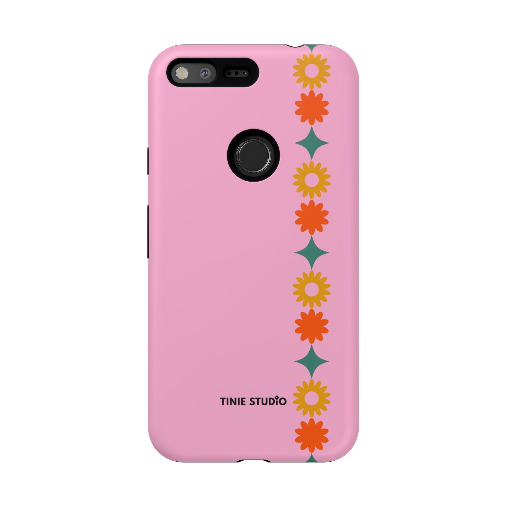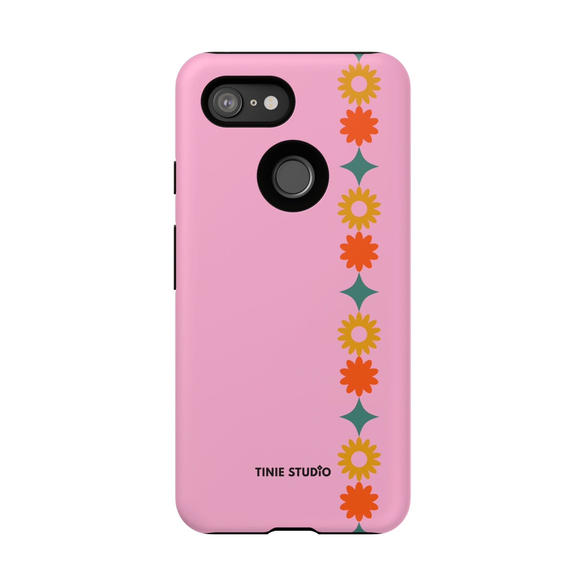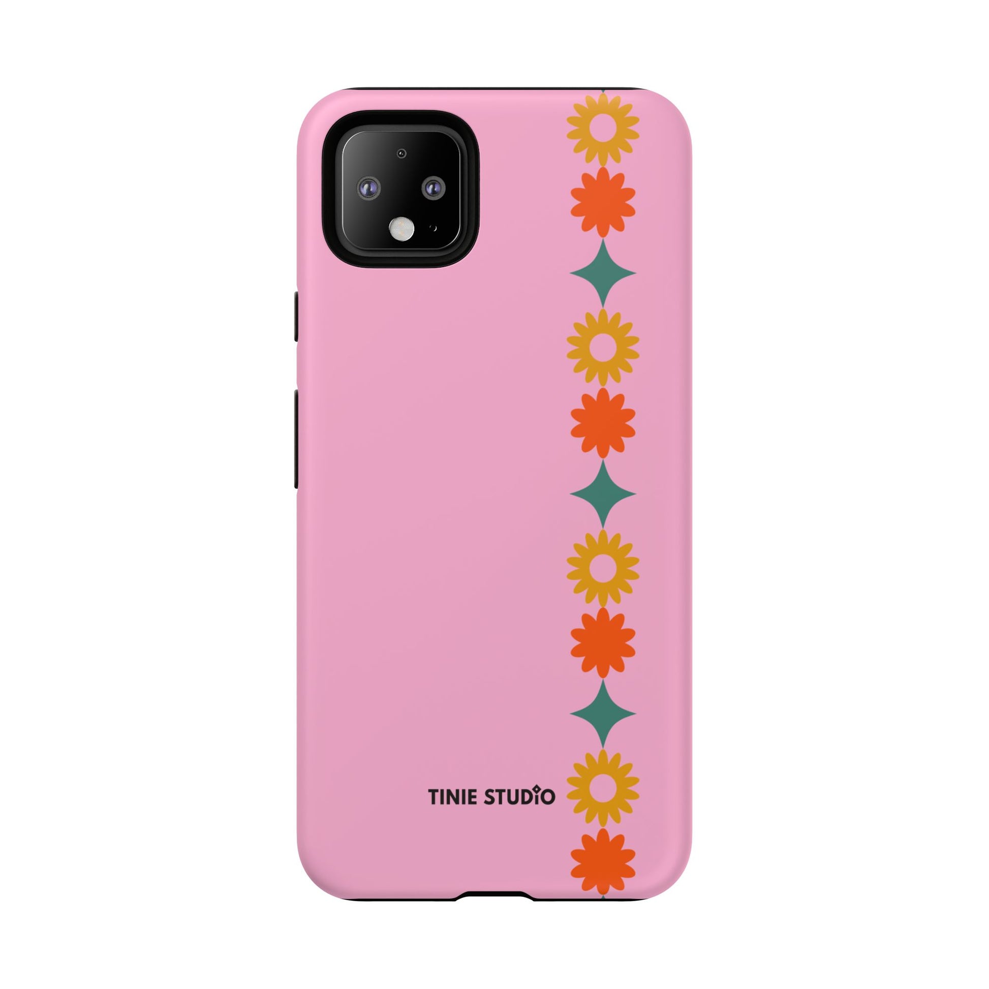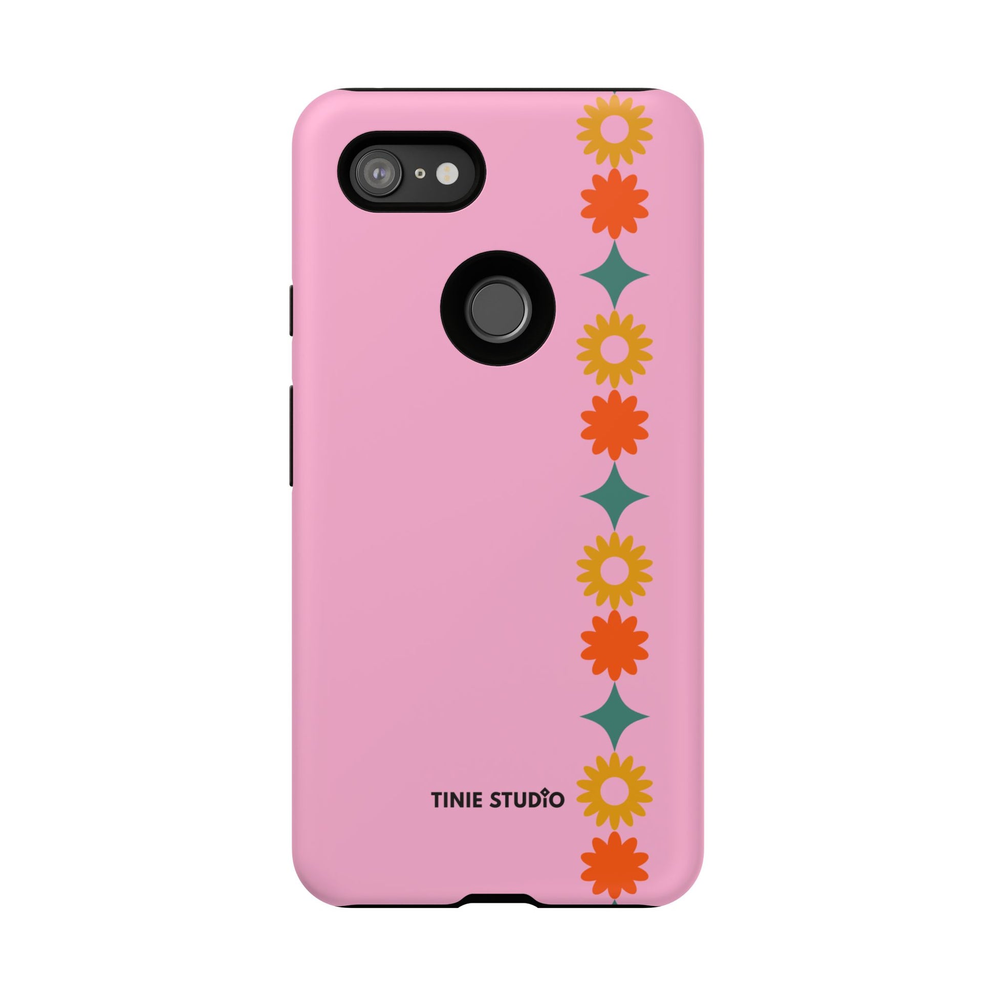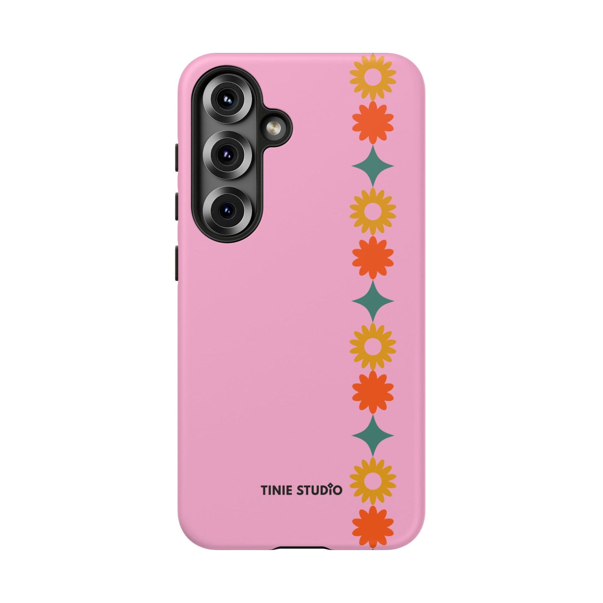 This design runs a cheerful column of graphic blooms in sunny yellow and fiery orange down a soft bubblegum pink backdrop. It’s playful, bright, and designed to make you smile every time you pick up your phone.