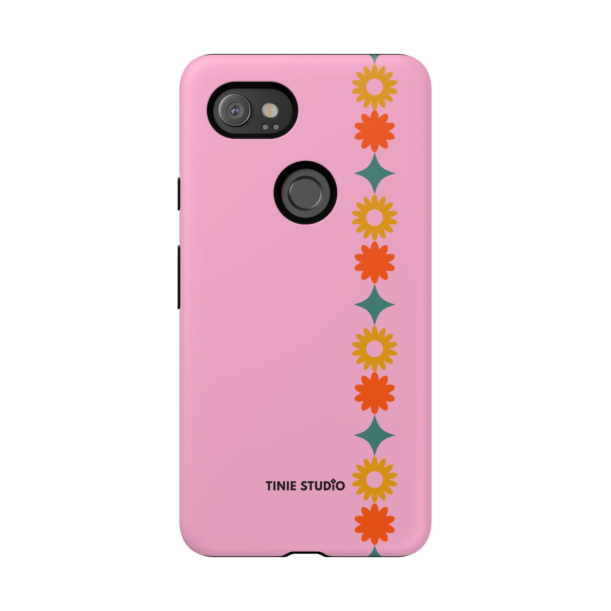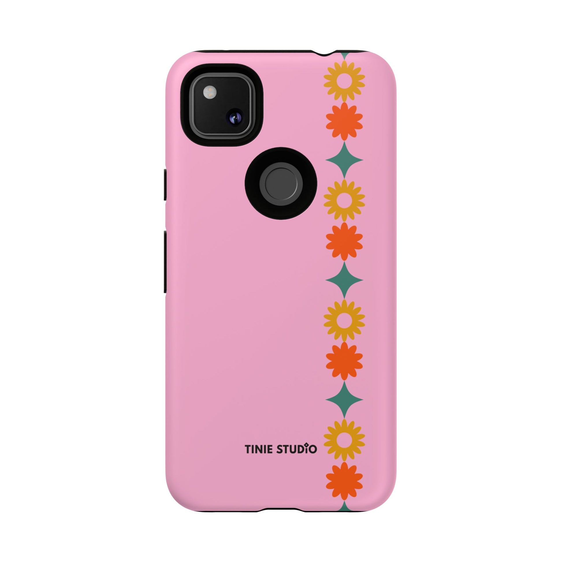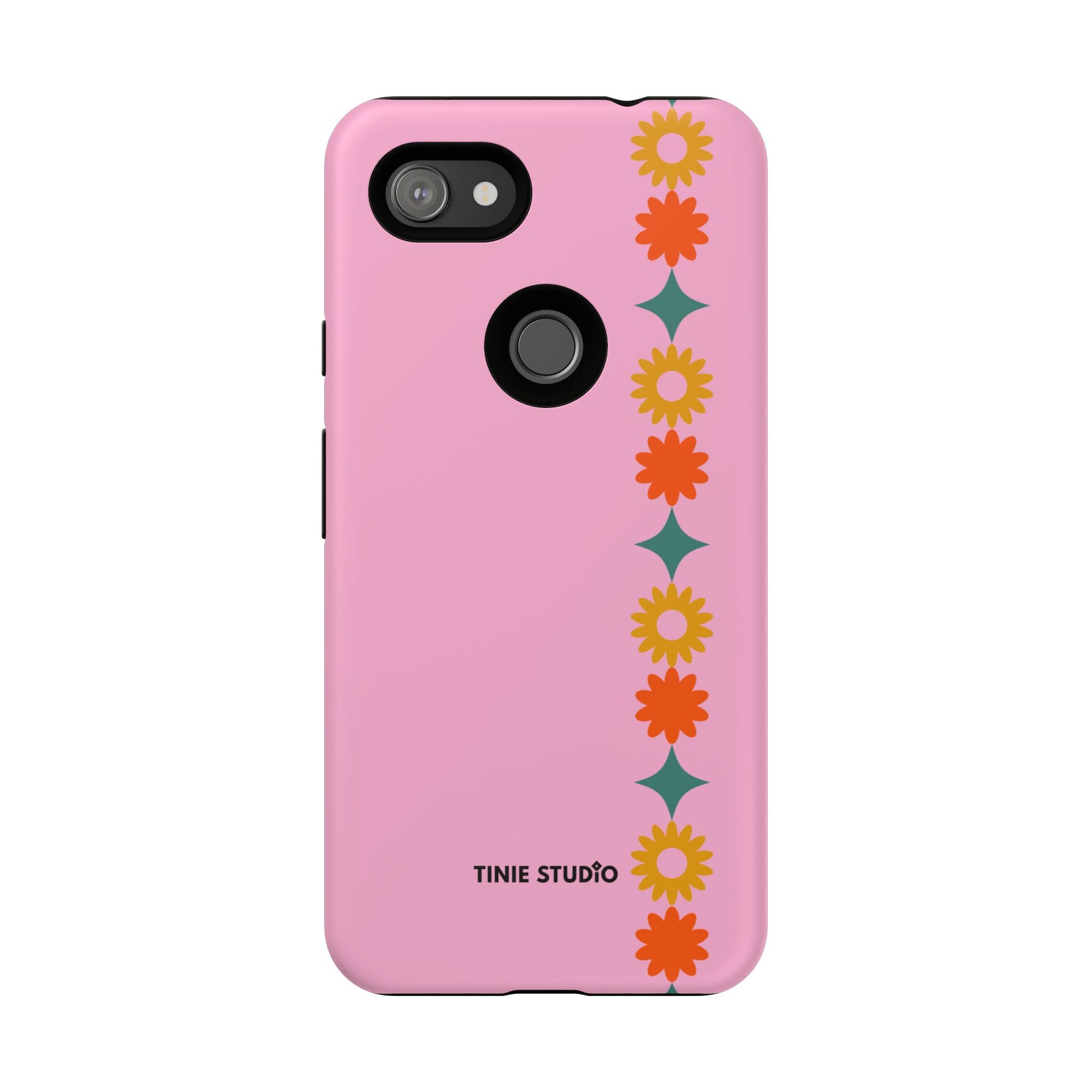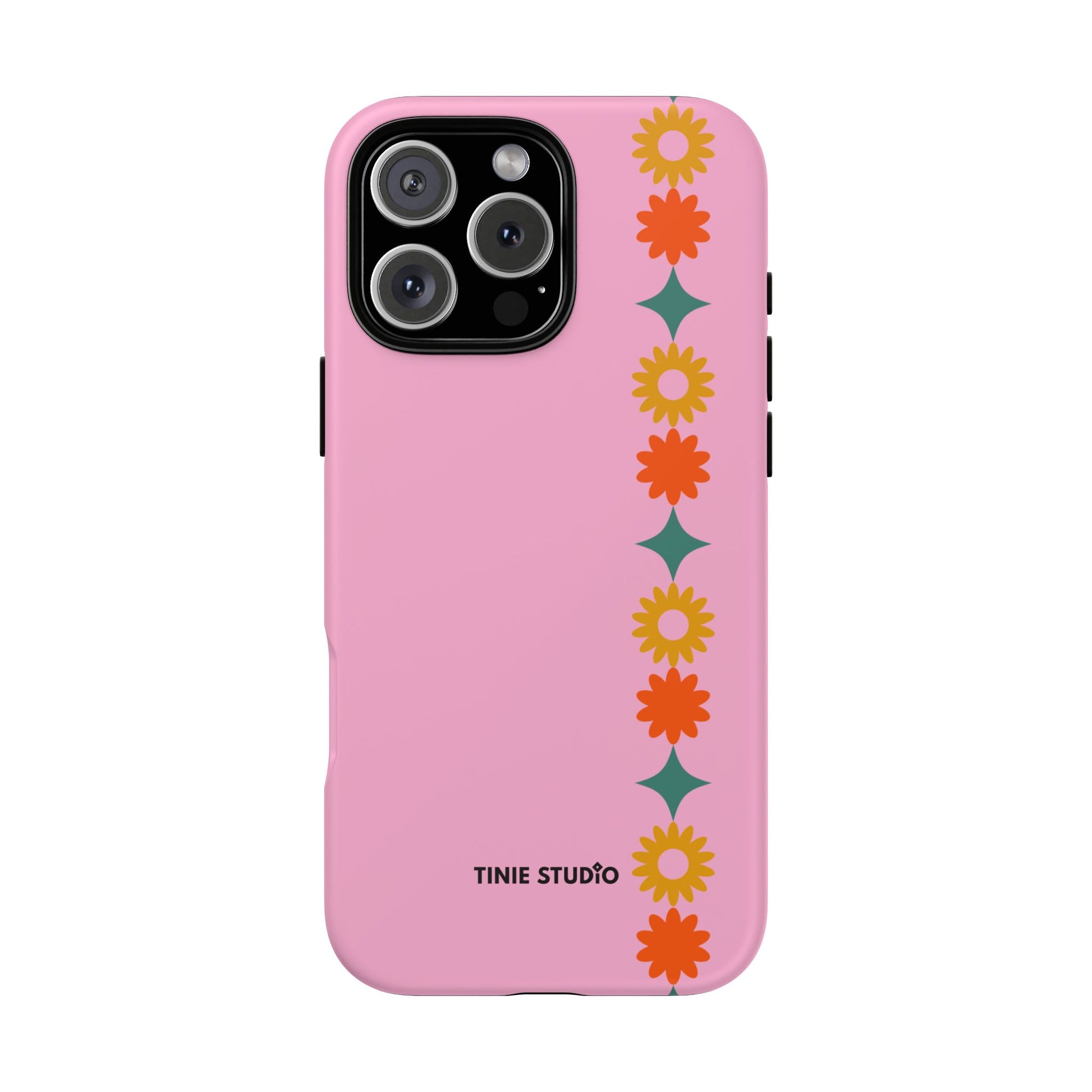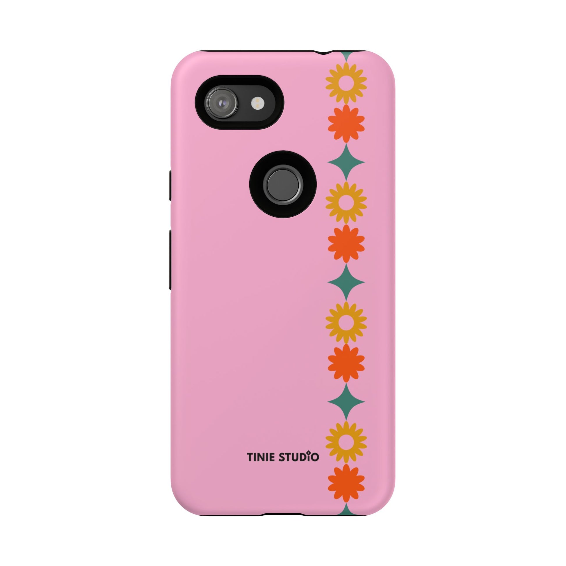This design runs a cheerful column of graphic blooms in sunny yellow and fiery orange down a soft bubblegum pink backdrop. It’s playful, bright, and designed to make you smile every time you pick up your phone.