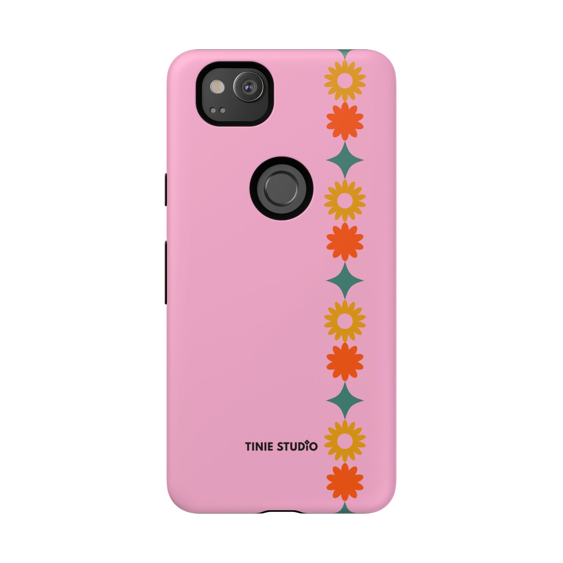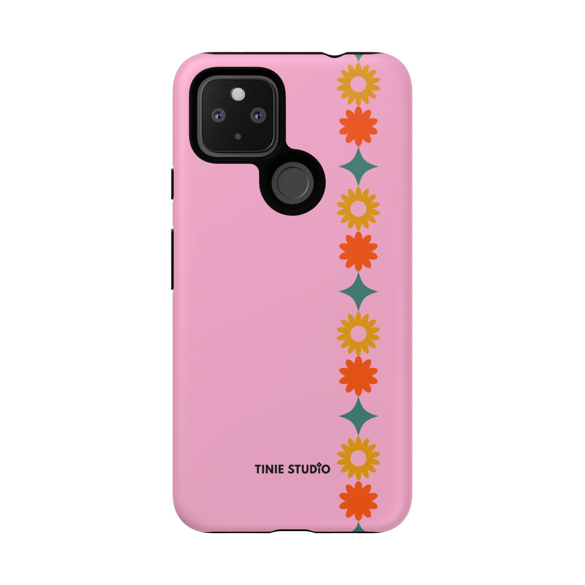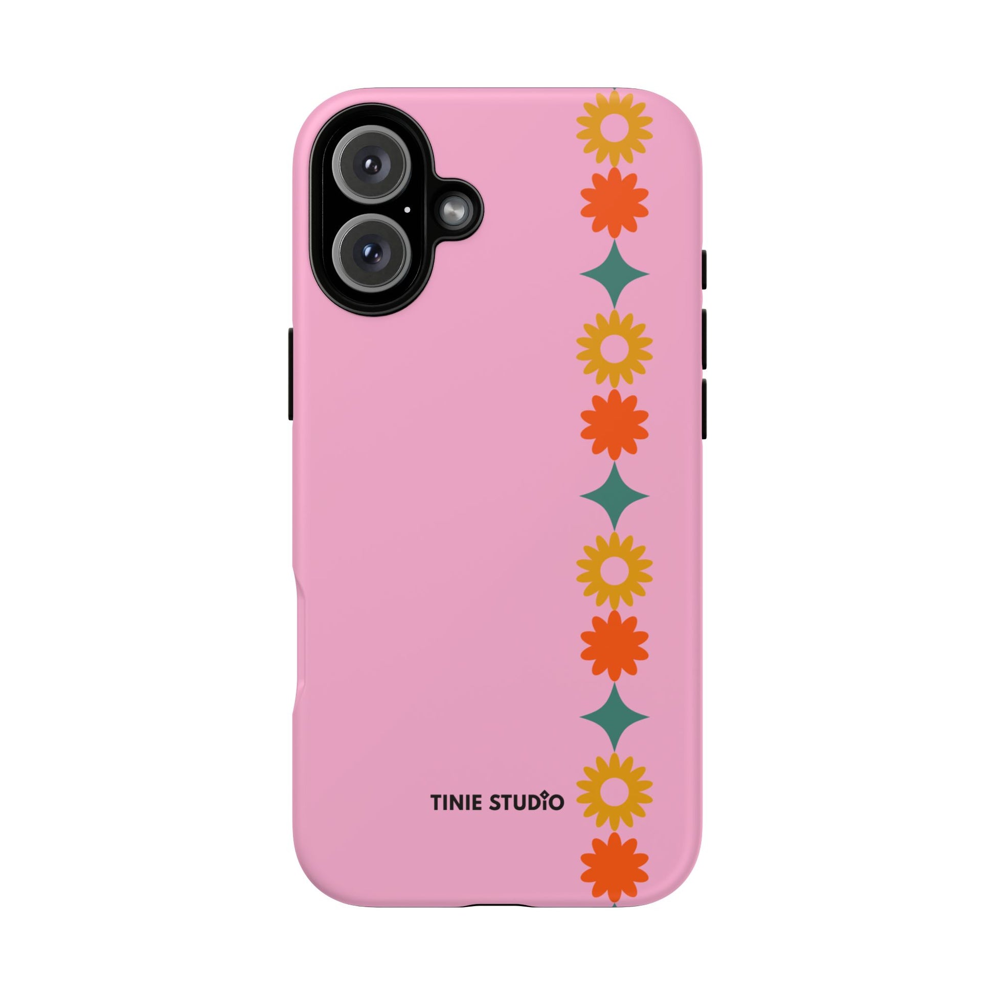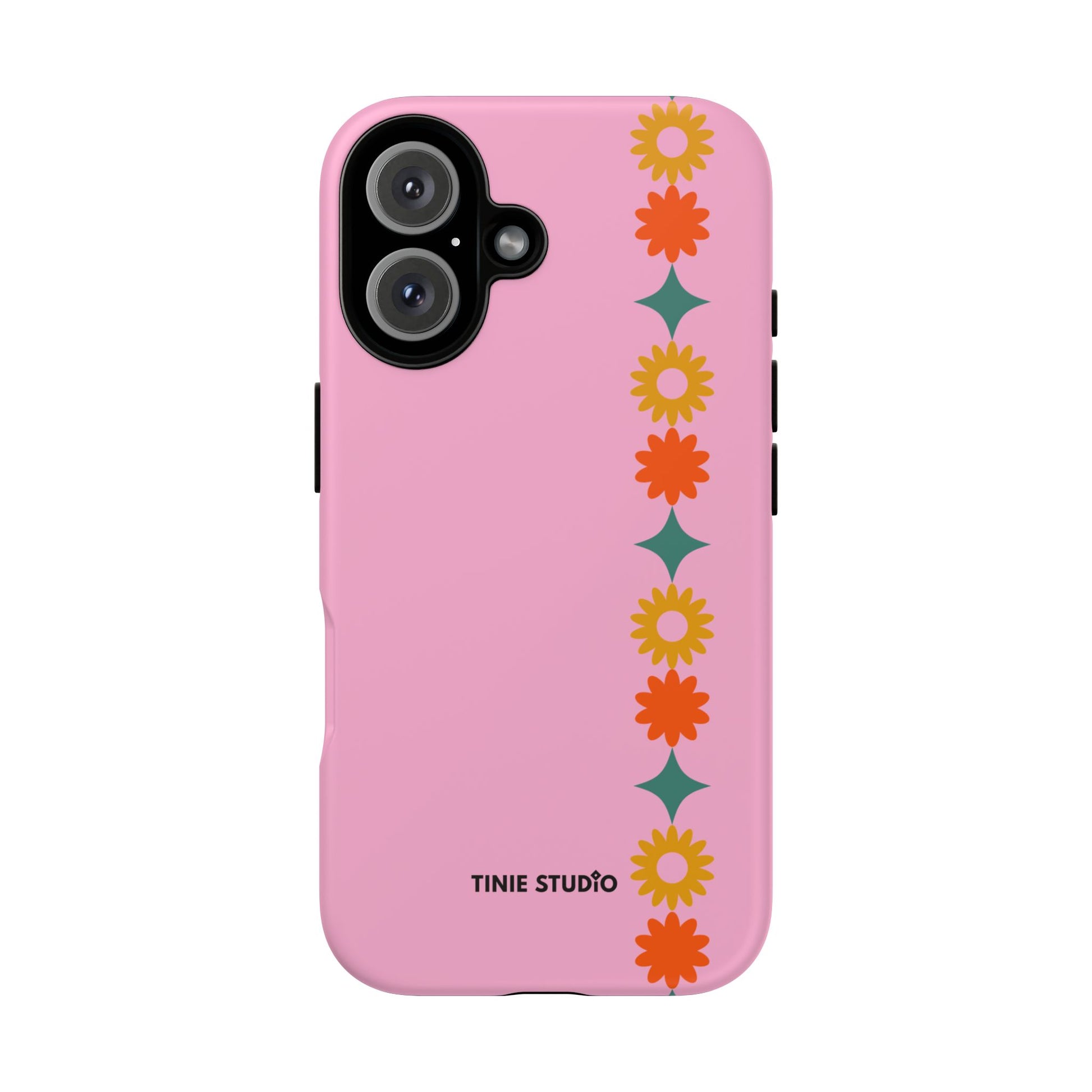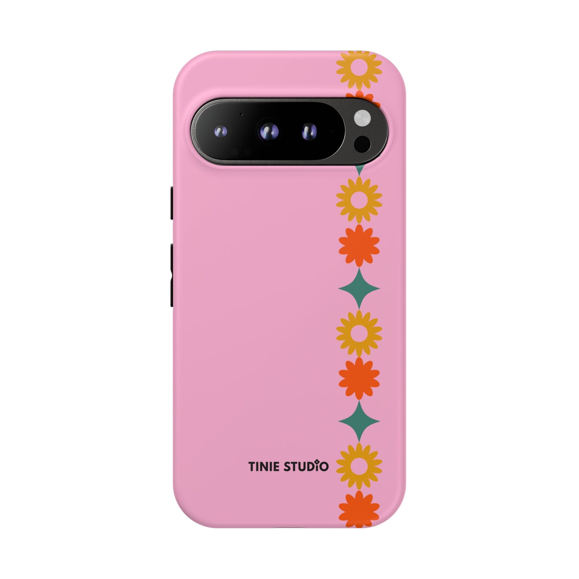 This design runs a cheerful column of graphic blooms in sunny yellow and fiery orange down a soft bubblegum pink backdrop. It’s playful, bright, and designed to make you smile every time you pick up your phone.